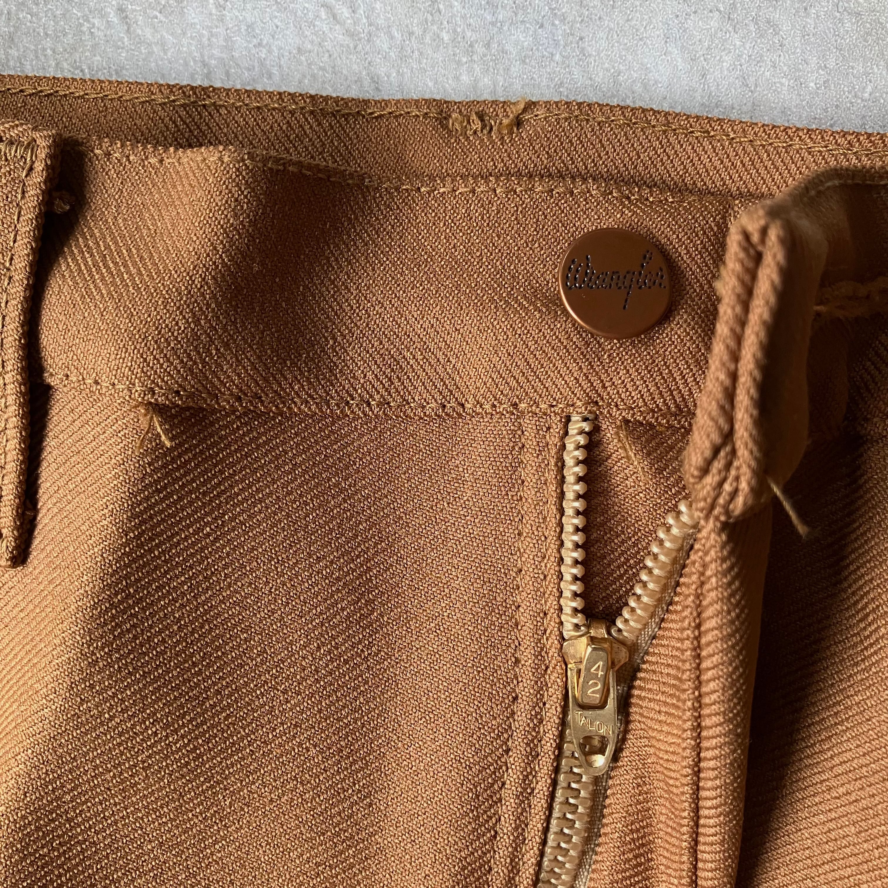ポリエステルのスタプレ生地。ビンテージ感のあるシナモンカラー。綺麗なブーツカットシルエット。USAメイドのOLDラングラー。TALON42ジップ仕様。