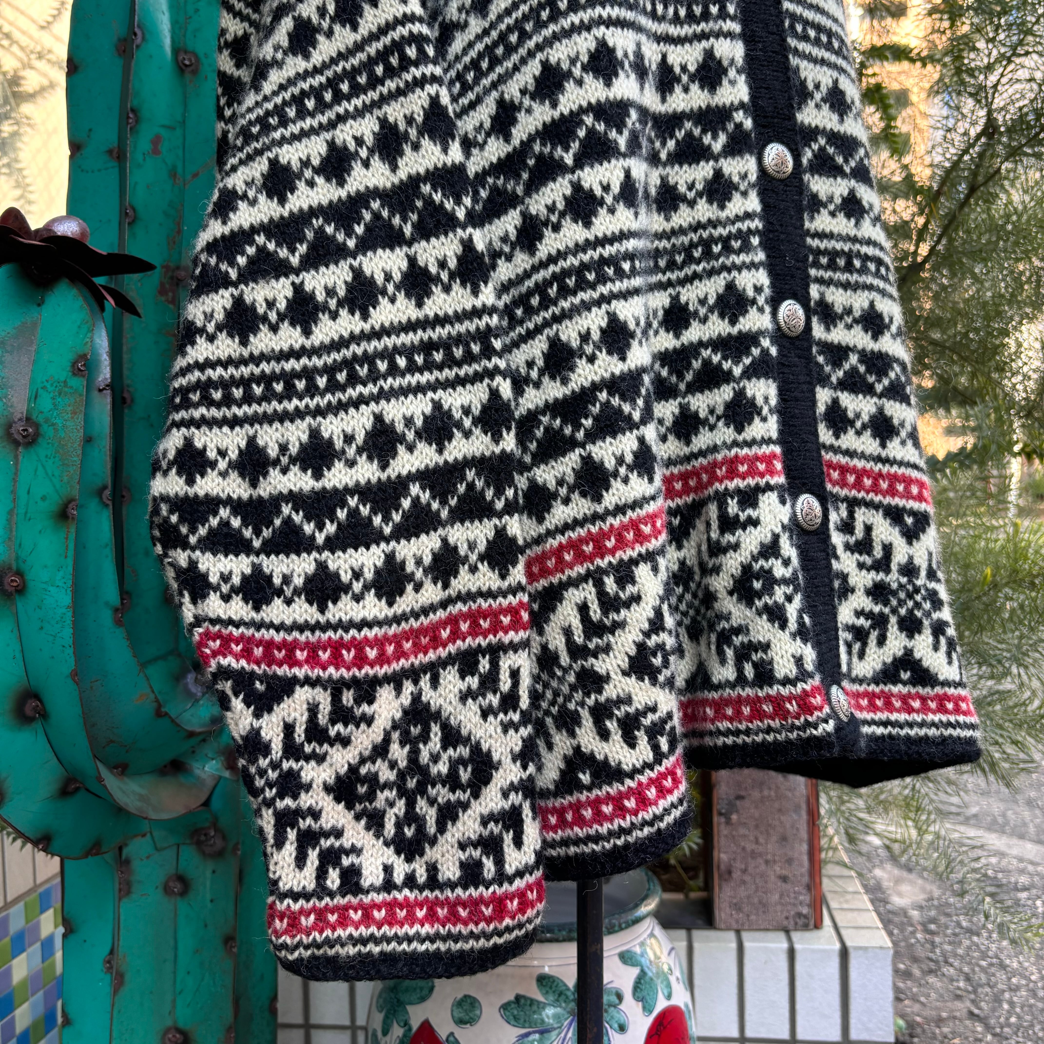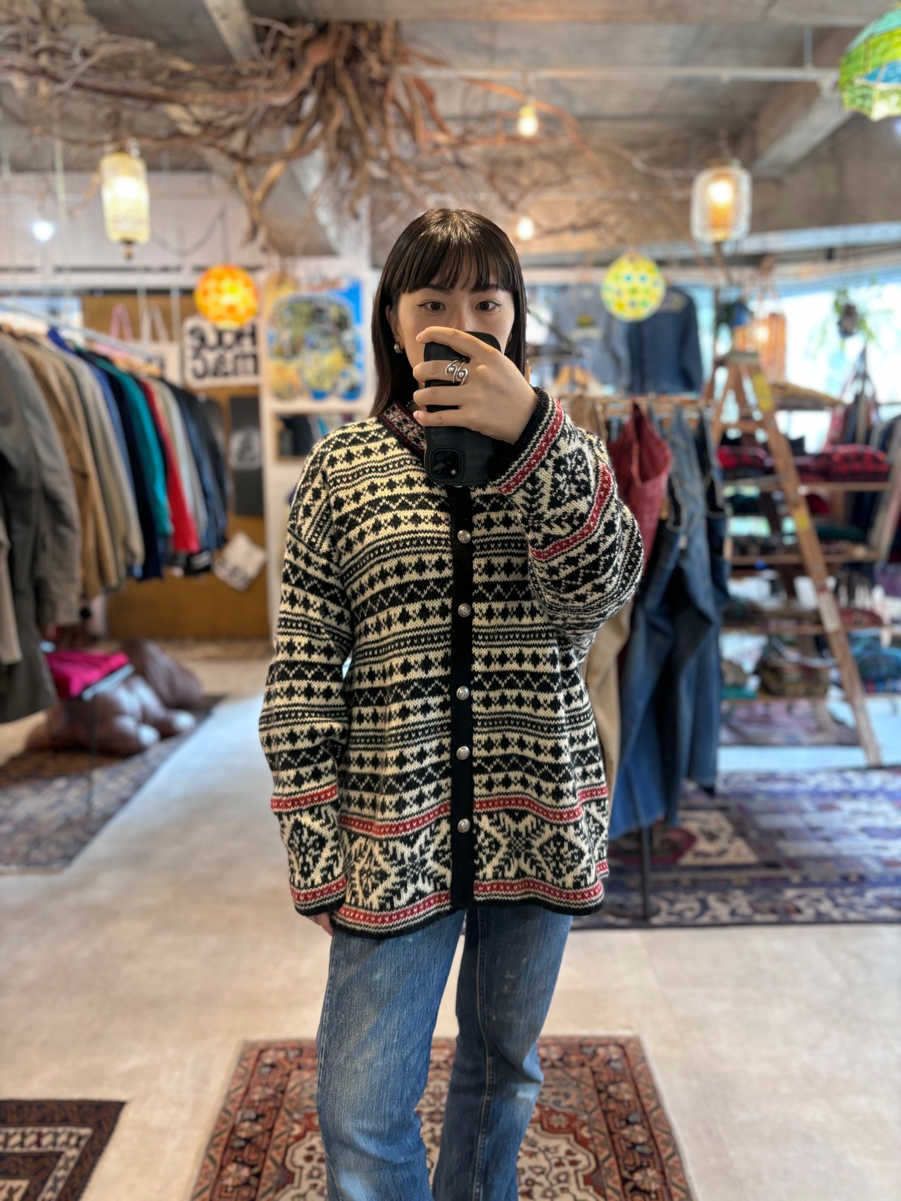 しっかりした厚みのあるウール生地。ゆとりのあるリラックスシルエット。アメリカ製のOLDモデル。クラシカルなノルディックパターン。替えのコンチョボタンも残る良好なコンディション。使い勝手抜群のカーディガンタイプ。