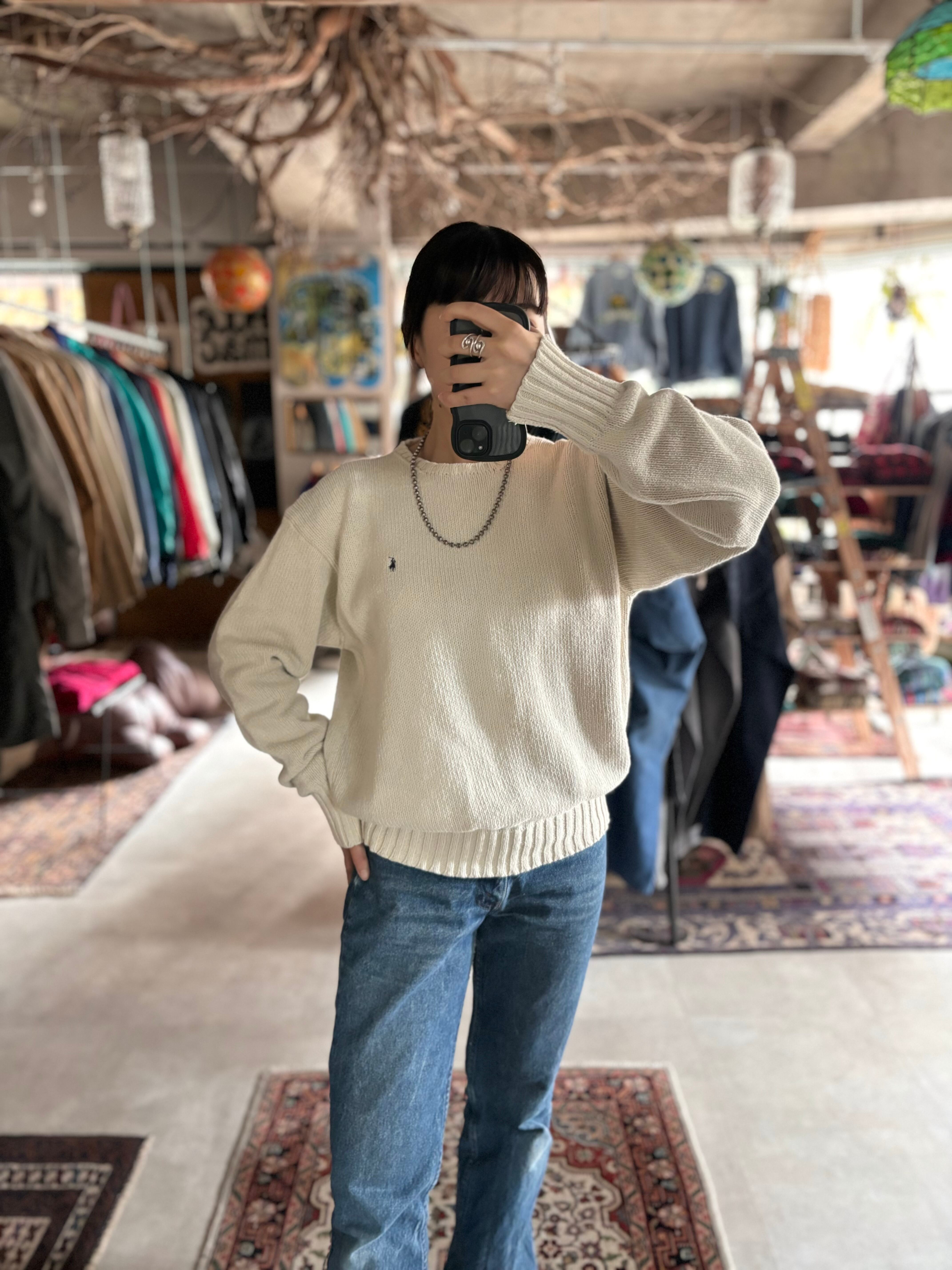 しっかりした厚みのコットンニット素材。身幅にゆとりのあるシルエット。オフホワイトカラーに、ブラックのポニー刺繍。素材感、シルエットともに間違いない安定感。ラルフローレンの中でも鉄板アイテム。