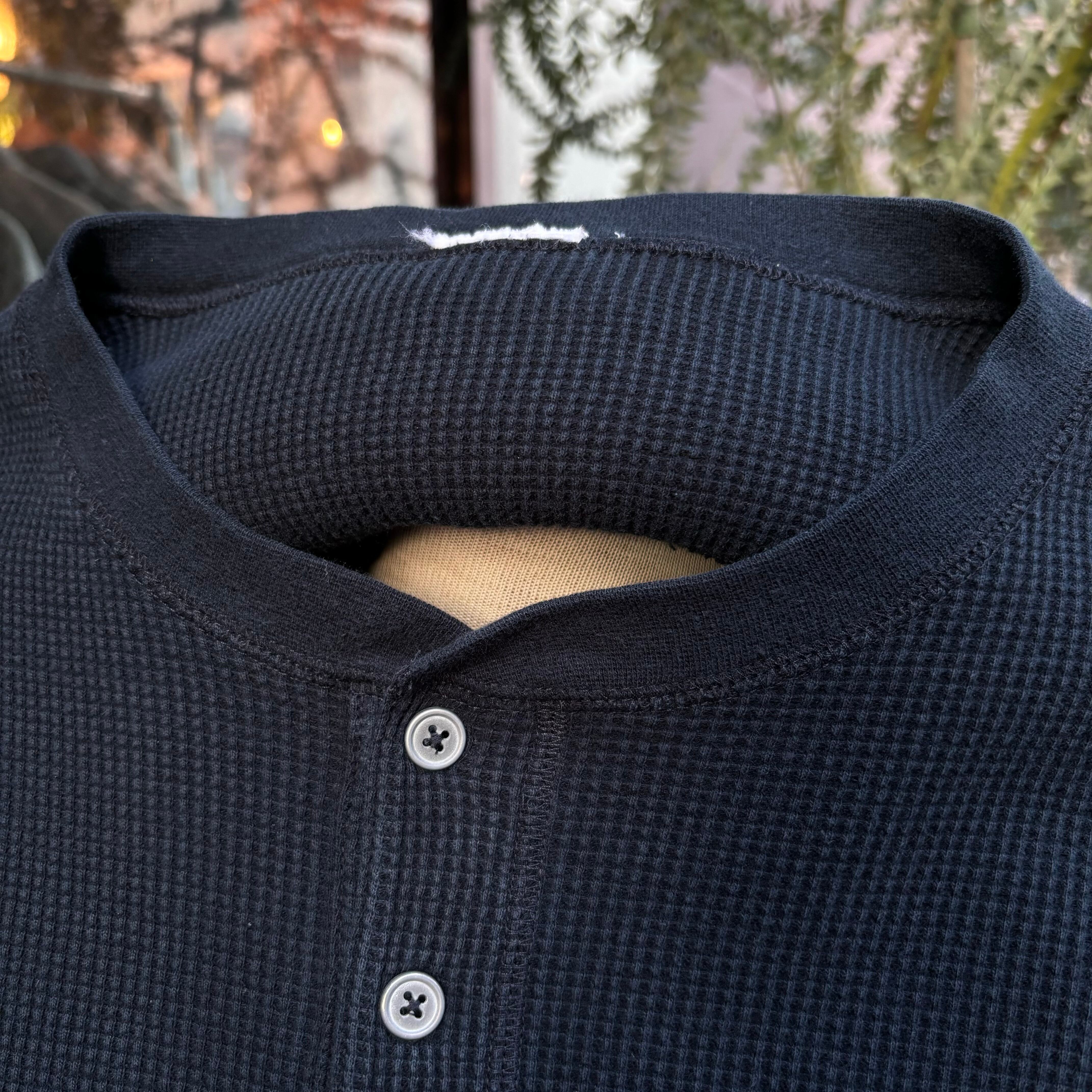 ブラックベースのサーマル生地。たっぷりした身幅のルーズなシルエット。ヘンリーネック仕様に、ティガーとイーヨーの刺繍入り。大人が着てもハマる絶妙な脱力感。程いい色褪せ感にOLDの雰囲気があります。