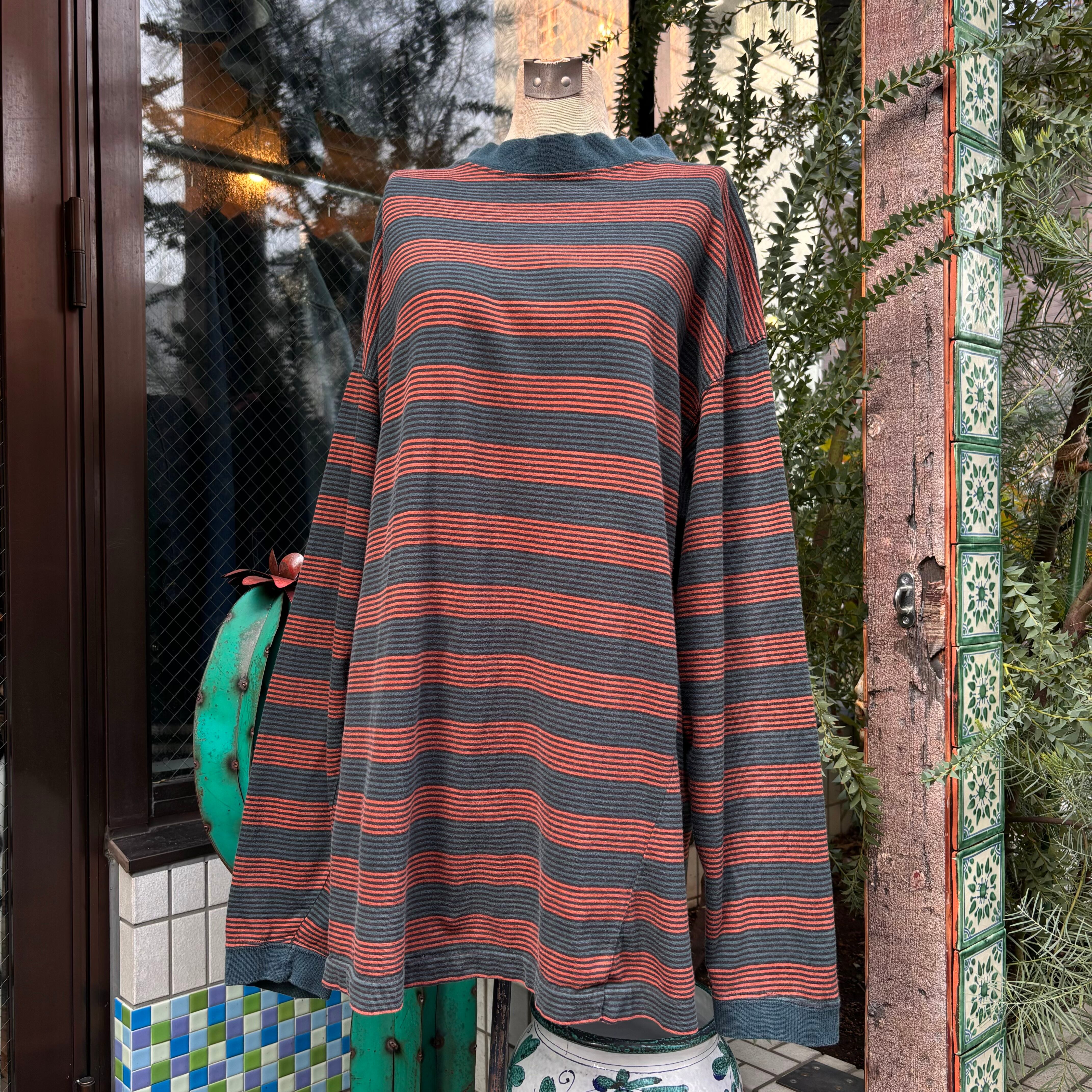 柔らかくスムースな肌触りのコットンカットソー生地。だらっと垂れるゆとりのあるリラックスフィット。グリーン×オレンジのボーダーがお洒落感抜群。気負わず手に取れる優秀トップス。
