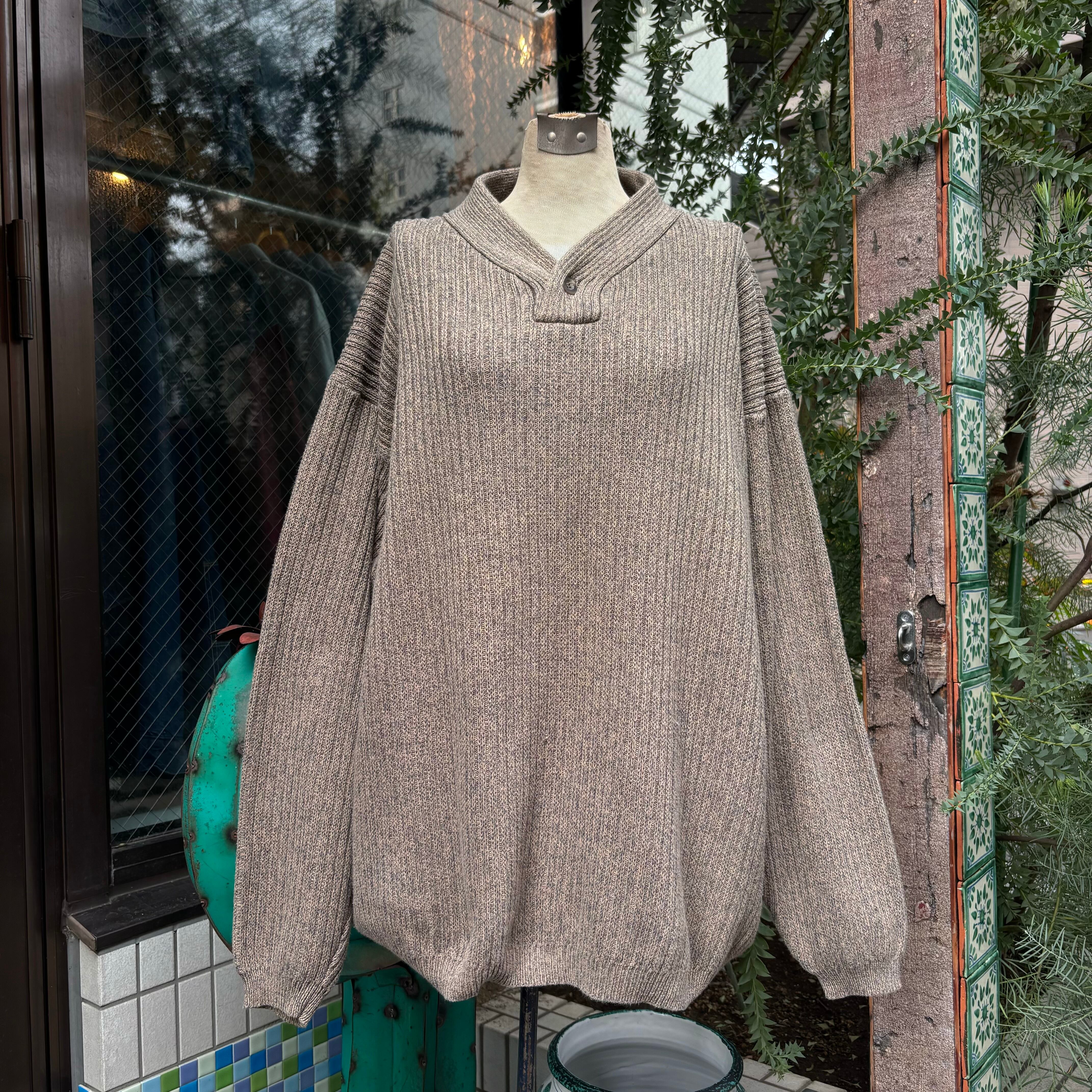 しっかりとした厚みのあるコットンニット生地。ゆとりのあるリラックスシルエット。やさしい印象のモカベージュカラー。ボタンがひとつ付く珍しい仕様のVネック。ホワイトタグのつくOLD Eddie Bauer製。カジュアルさとノスタルジーな雰囲気を楽しめる良いデザイン。