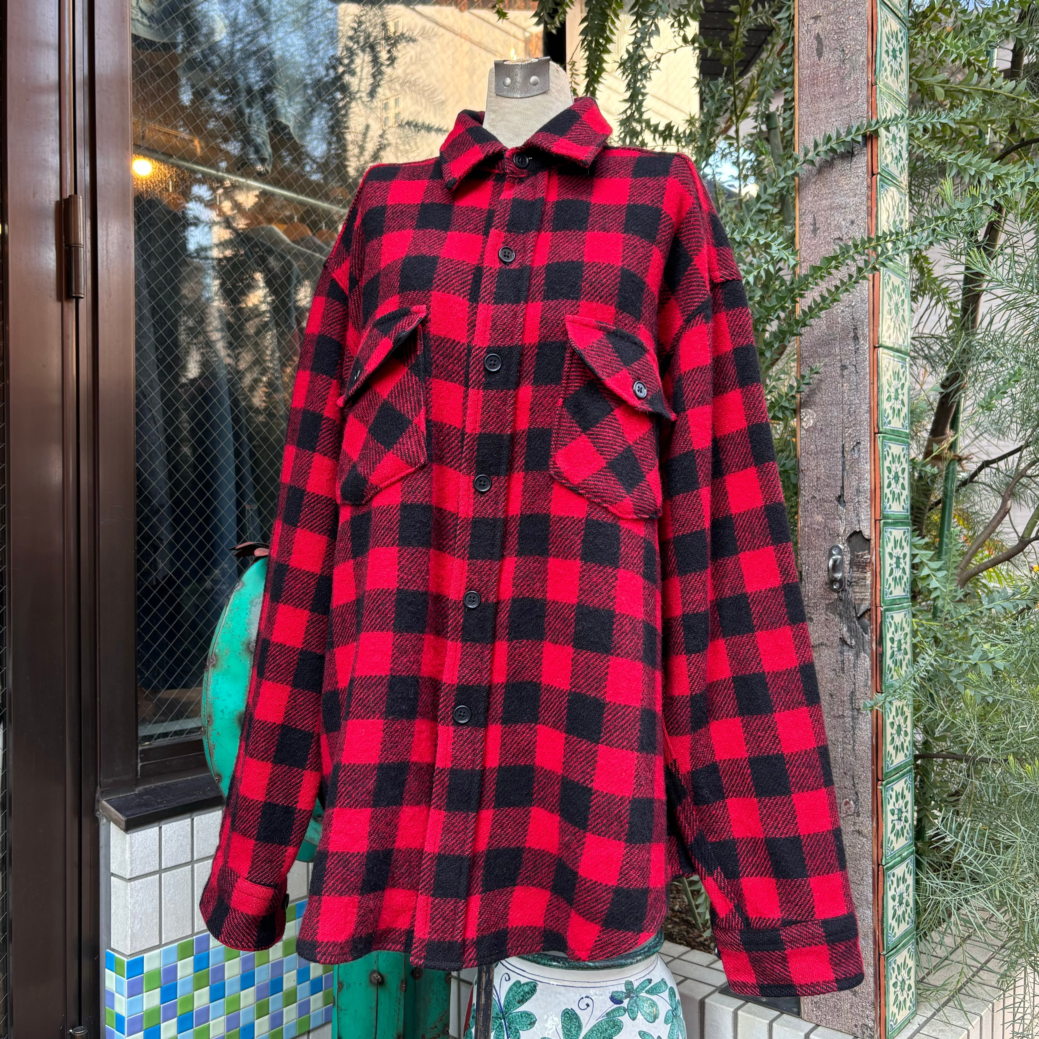 肉厚で柔らかい上質ウール。着心地は軽く、あたたかさも抜群。たっぷりした身幅に着丈短めのシルエット。トラディショナルなワークスタイルに、赤黒のバッファローチェック。綺麗なコンディション。ユニセックスでおすすめの1枚です。