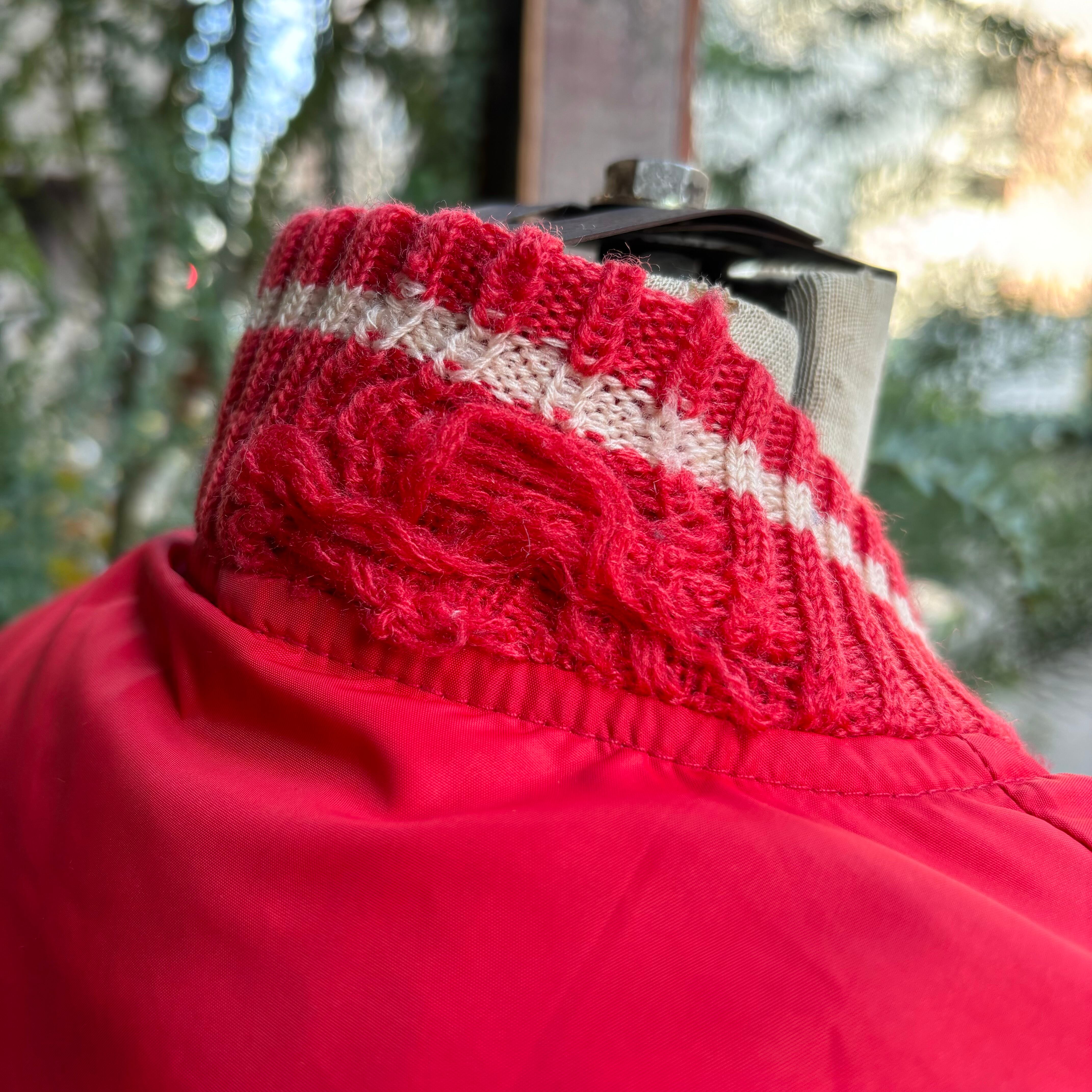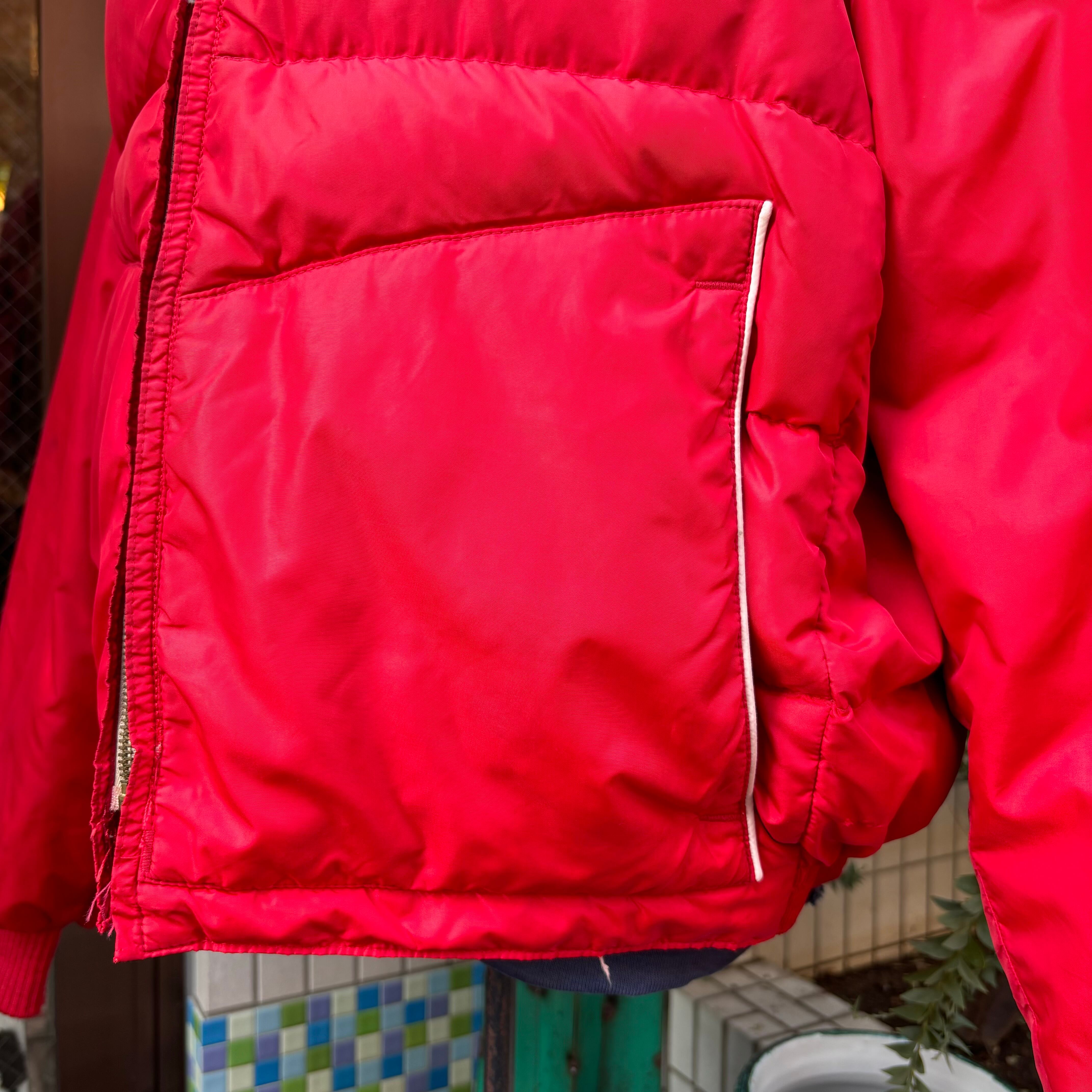 軽いナイロン素材に、中綿にはダウン入り。広めの身幅に、着丈短めのシルエット。いなたいウエスタンヨークに、OLDアウトドア感のあるレトロなレッドカラー。ビンテージ感の強いブラスのコーツ&クラークスジップ仕様。現代的な着こなしにもマッチするおすすめのビンテージダウン。ユニセックスでおすすめです。
