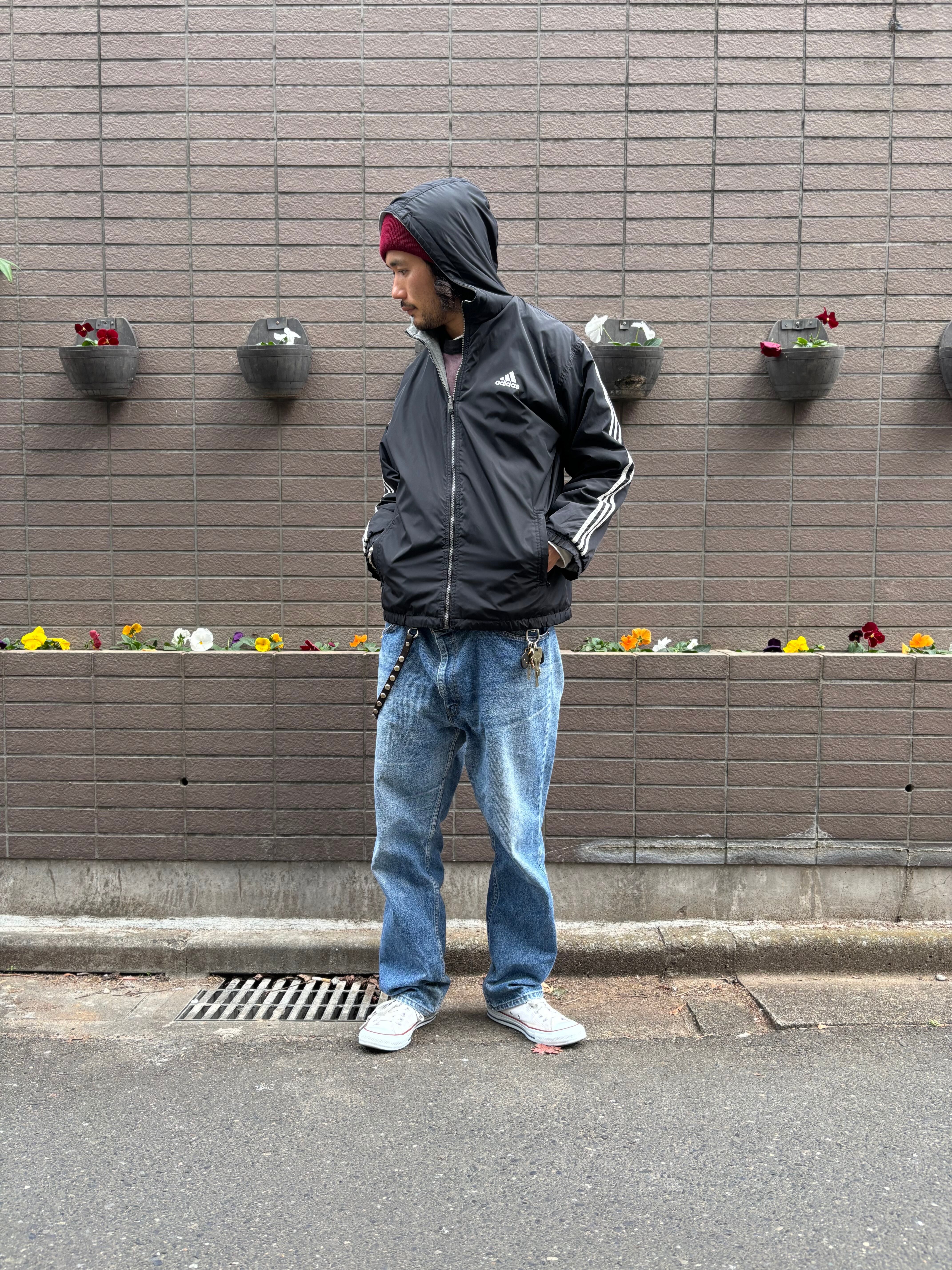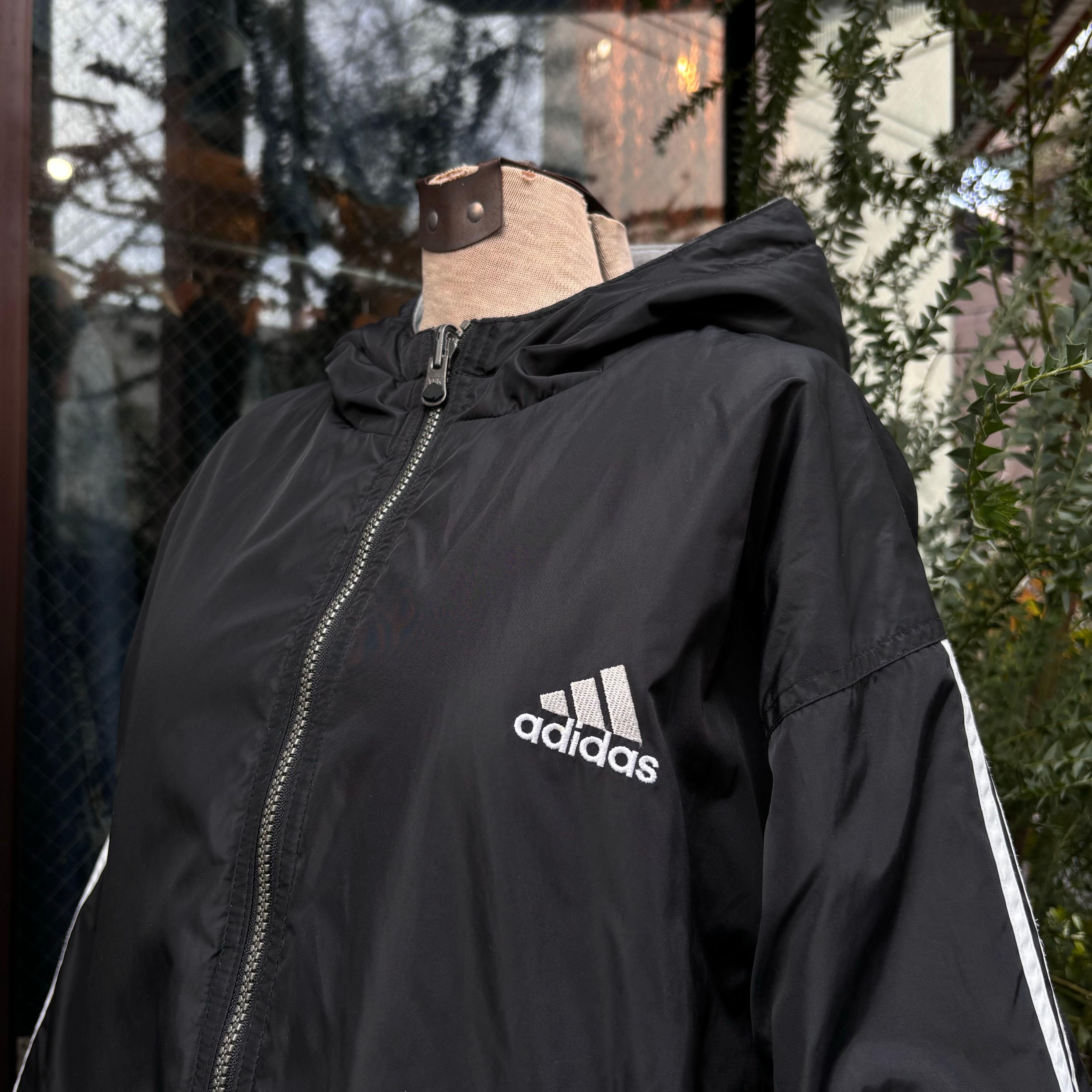 ブラックベースのナイロン生地と、グレーベースのスウェット生地のリバーシブル。程よくゆとりのあるシルエット。BOYSのXLと思われる絶妙シルエット。どちらの面も使い勝手の良いデザイン。万国旗タグ仕様。お洒落用として様になる良いOLD ADIDAS。