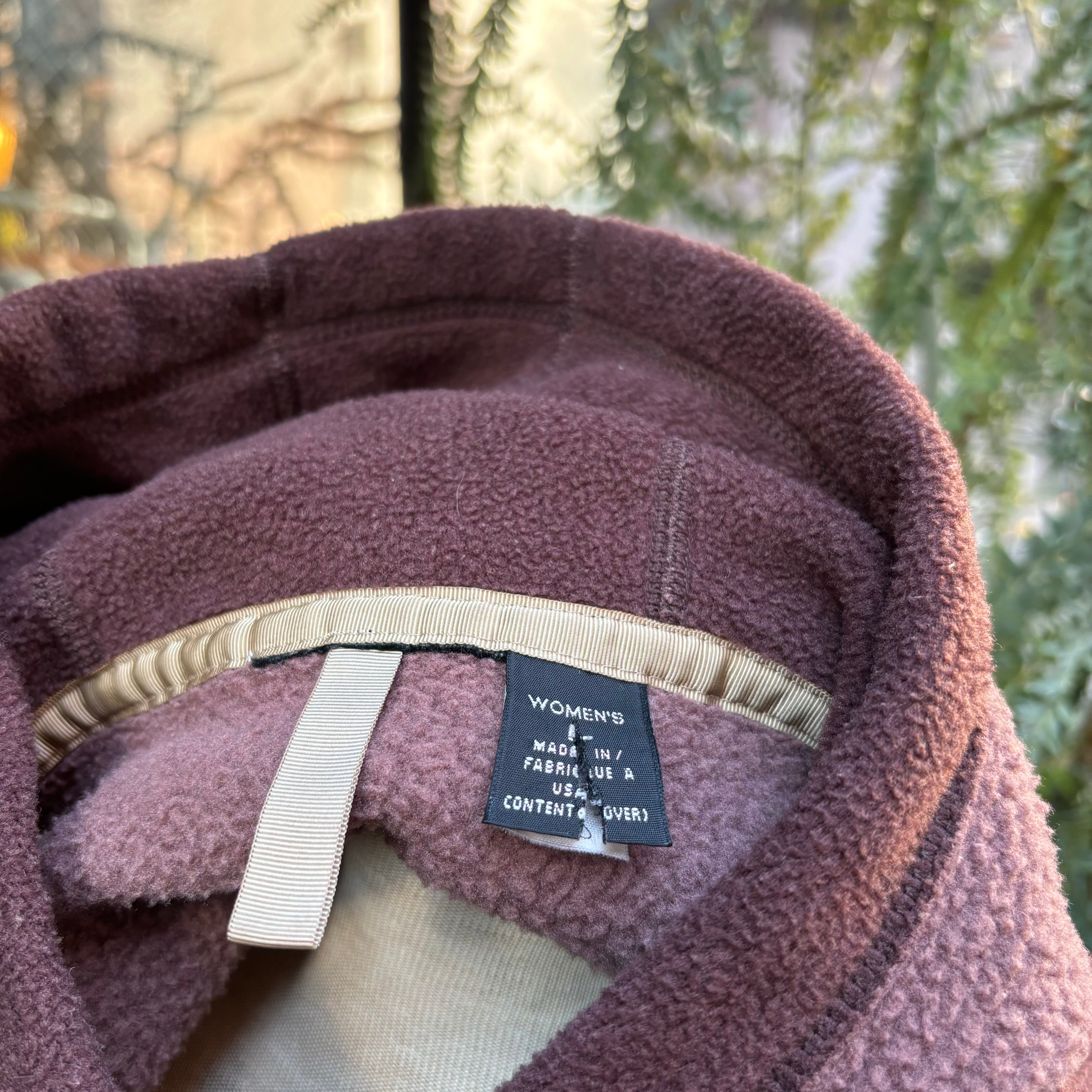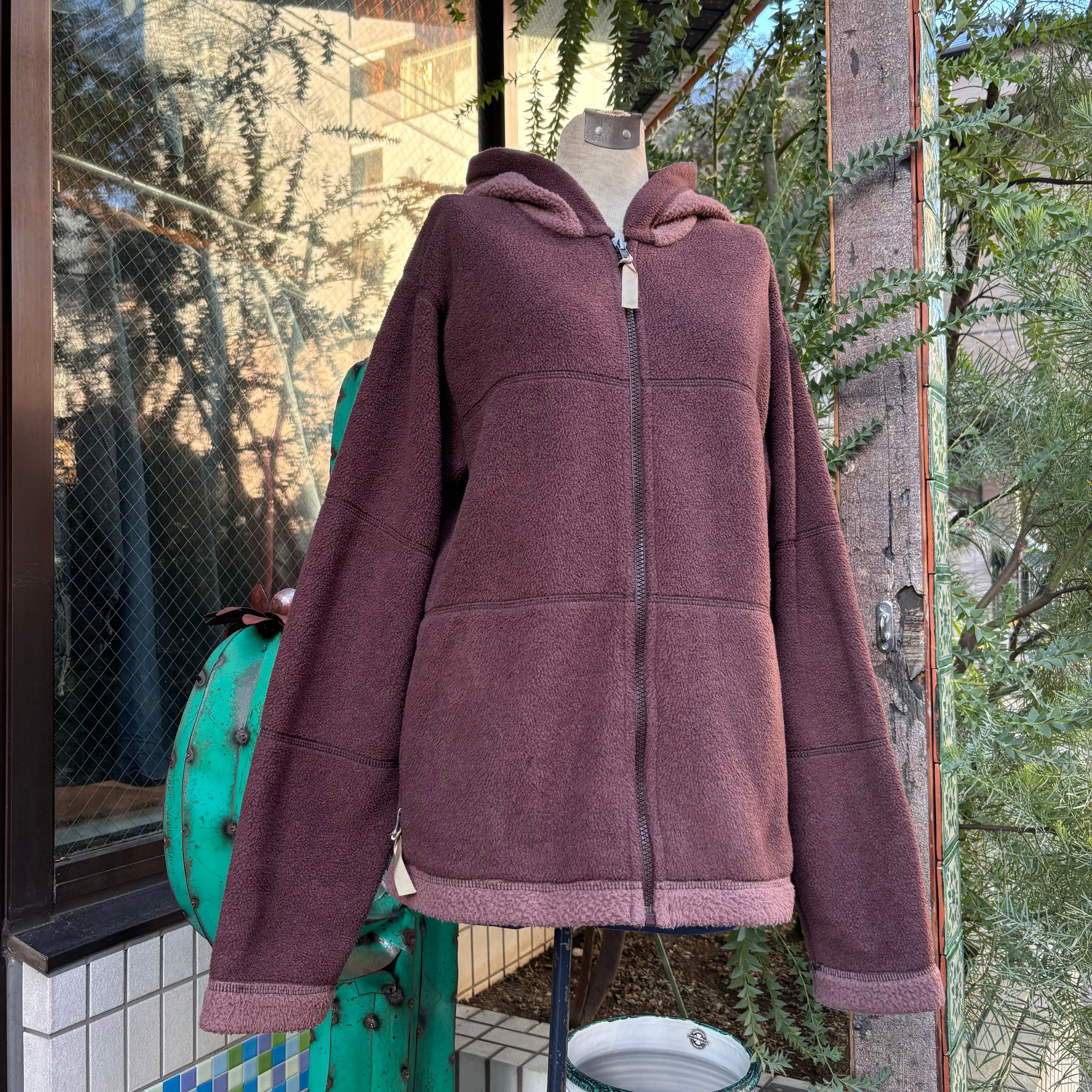 マルーンブラウンカラーのフリース生地。ゆとりのあるリラックスシルエット。USA製のPATAGONIA。切り返しが多く入る立体的なパターン。大きめのフード。アウトドアブランドらしい雰囲気と洗練されたお洒落感のある1着。