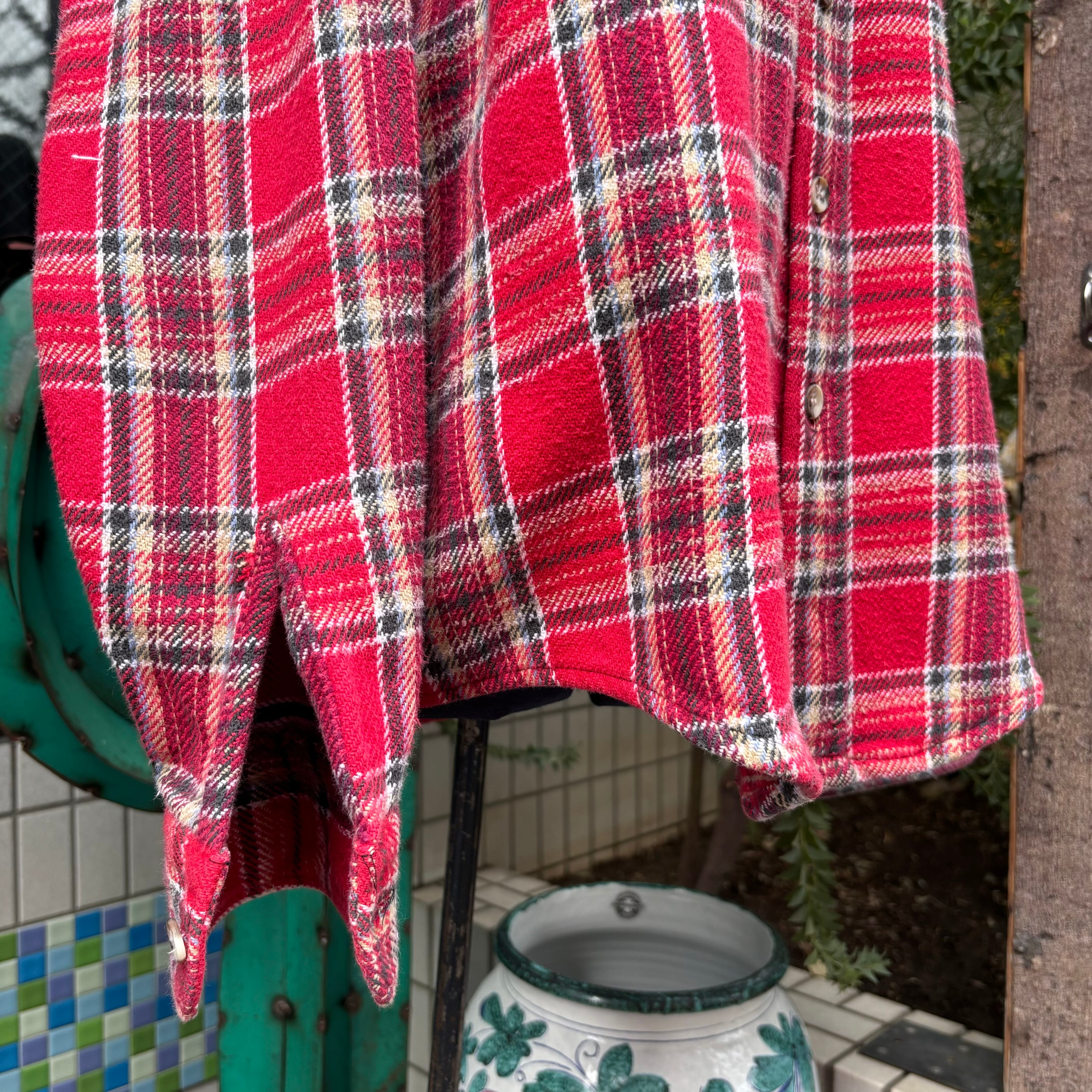 しっかした厚みのコットンフランネル。前を開けて羽織としても使い易い身幅が広く、丈が短めのシルエット。王道アメカジ感のある赤系のチェックパターン。USAメイドのビンテージBIG MAC製。通年、着回せること間違いなしのおすすめヘビーネル。定番のわりに、入荷は少ないです。