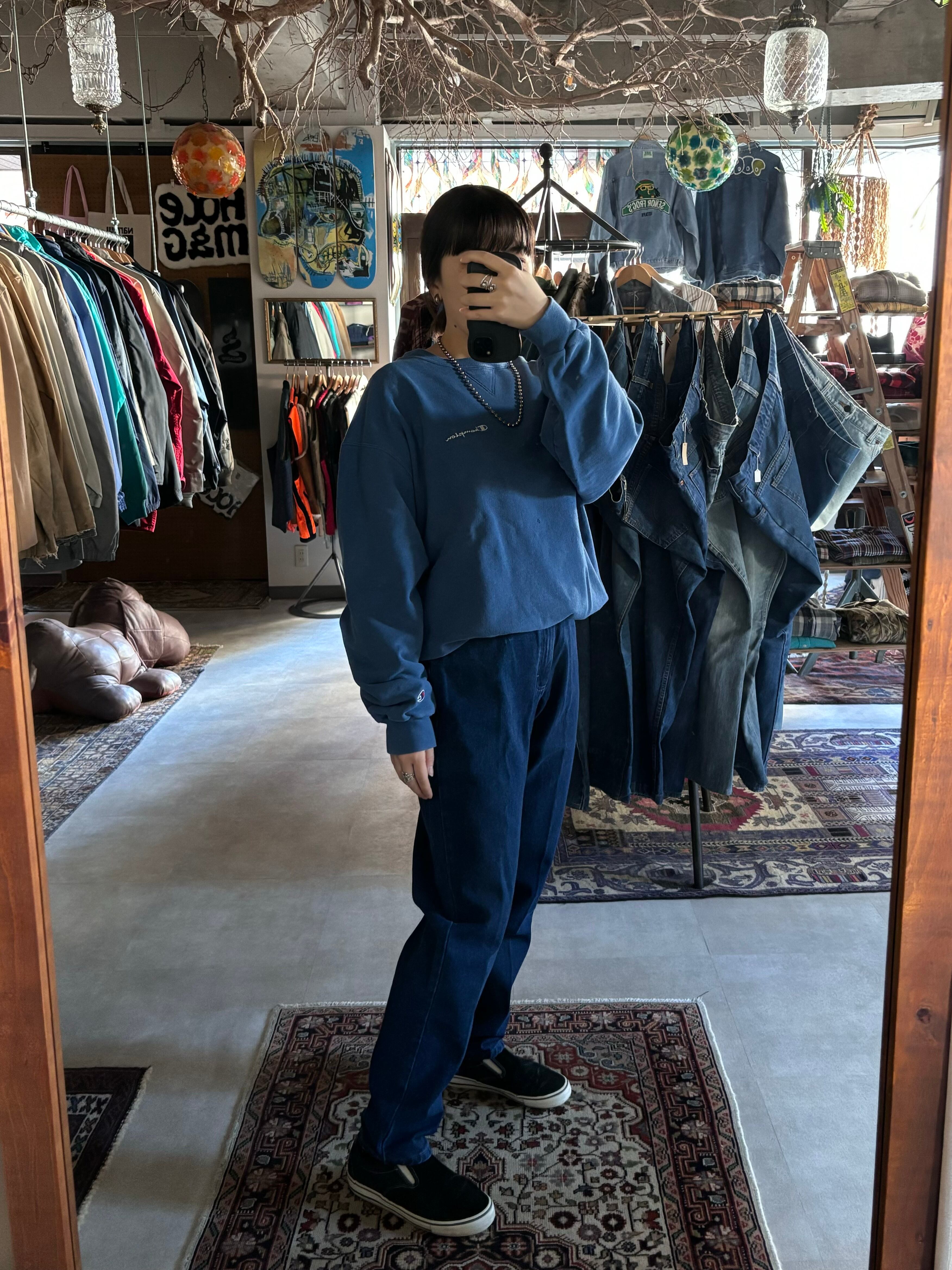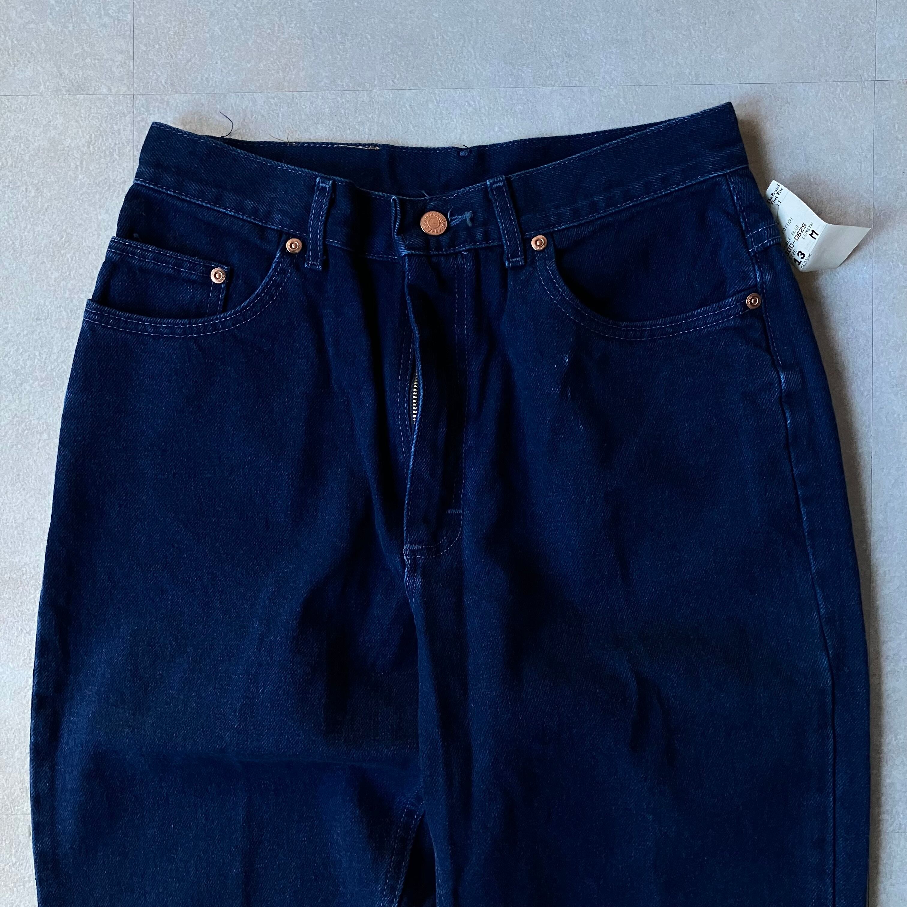 ネイビーカラーの厚手のカラーデニム。ウォッシュド加工が入ったやわらかめの生地感。ゆとりのある股上に、短めレングスのテーパードシルエット。フラッシャーの残る希少なDEAD STOCK。USAメイドのビンテージモデル。レディース規格なので腰回りにゆとりがあり、履き心地抜群です。トップスが引き立つシルエットのおすすめパンツ。