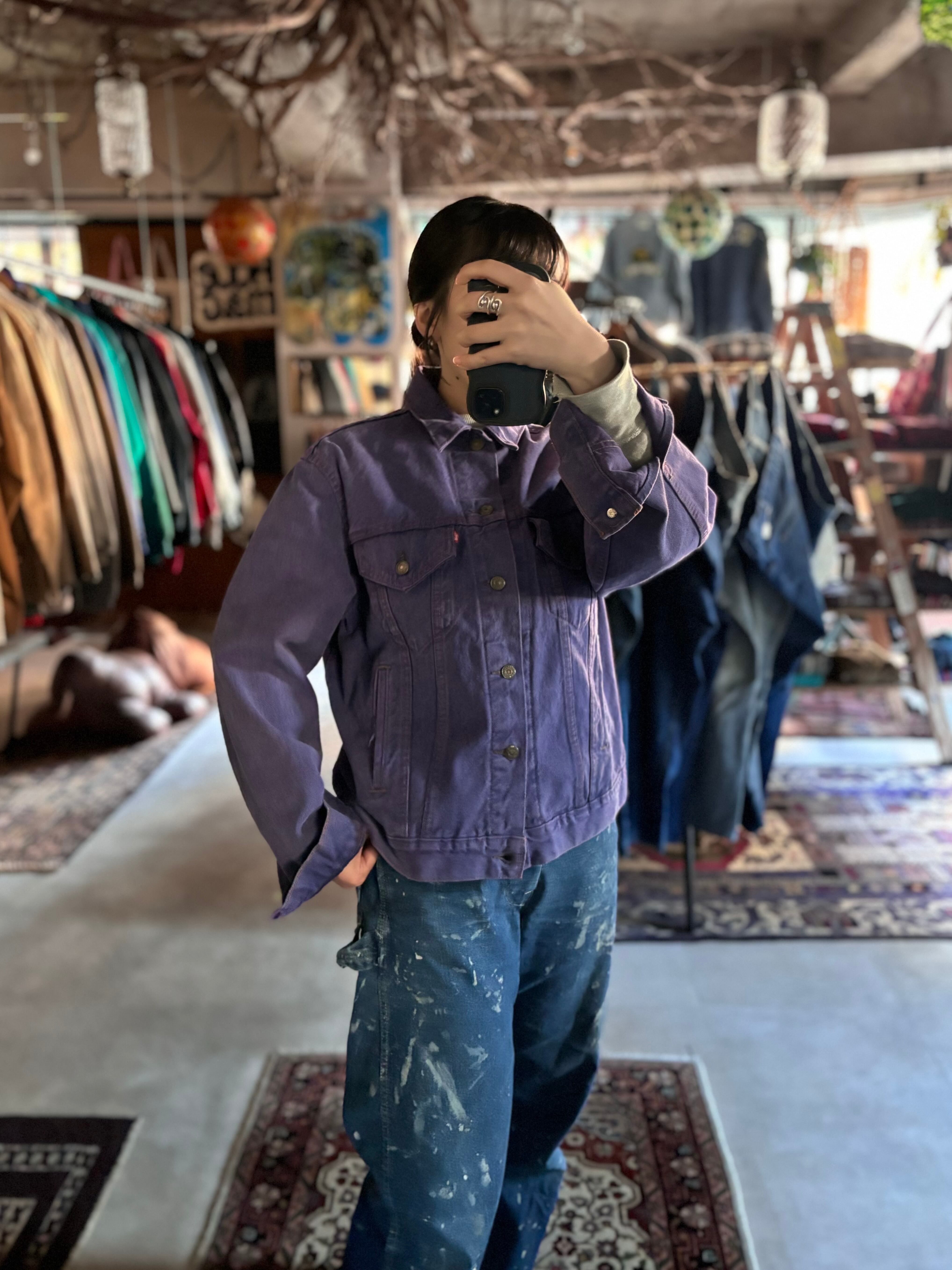 しっかりした厚みのコットン素材。程よくゆとりのあるシルエット。珍しい後染めのパープル。USAメイドのビンテージLEVI'S。タウンユースし易い4ポケットタイプ。ジャストのパンツと合わせるととてもカッコいいおすすめの1着。