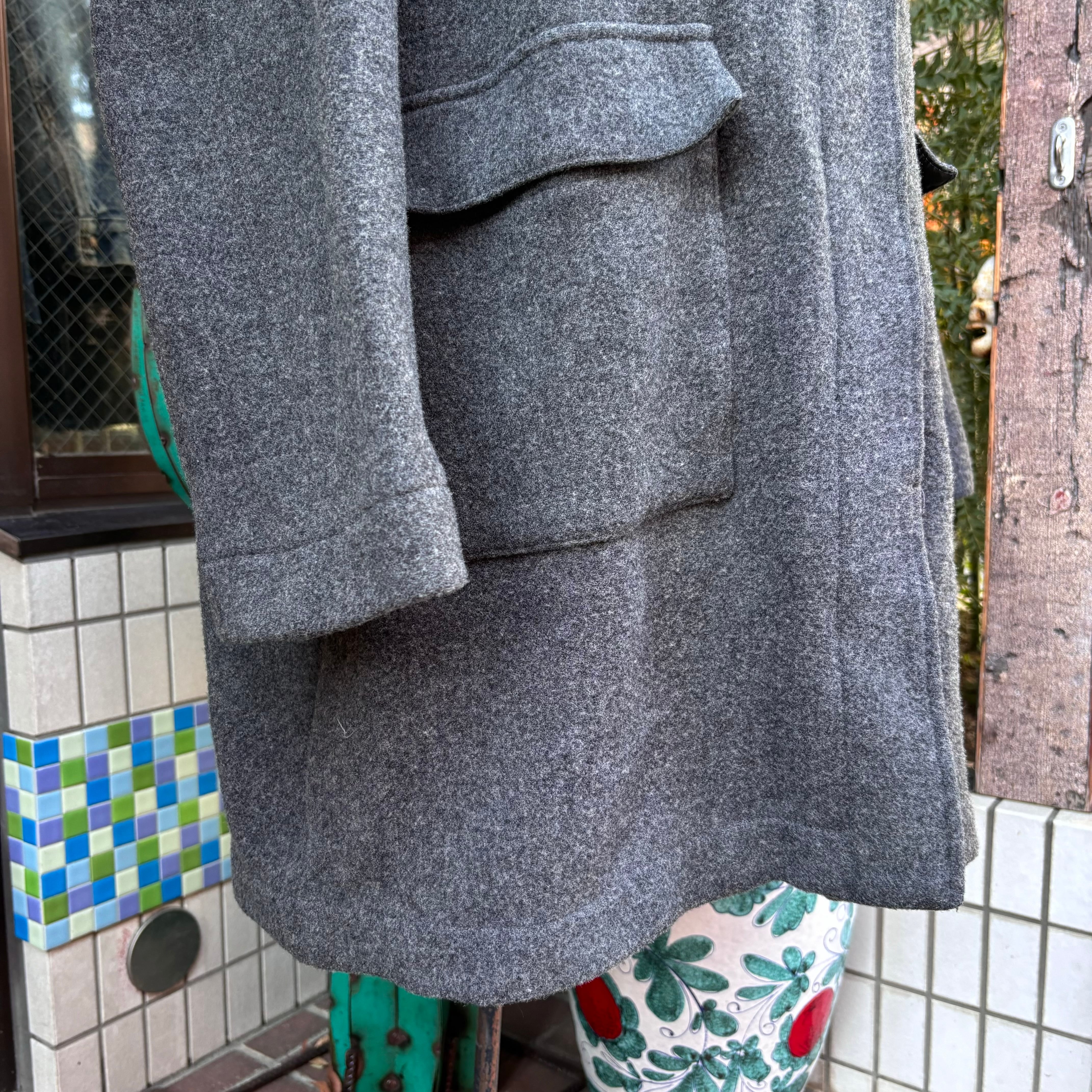 しっかりと厚みのあるウール素材。たっぷりした身幅に、長すぎないハーフ丈仕様のパーカー型。フロントに大きめのフラップポケットが付くのみのシンプルなディテール。クールな印象の比翼スタイルに、大きめのフードが絶妙なバランス。USAメイドのOLDエディバウアー製。