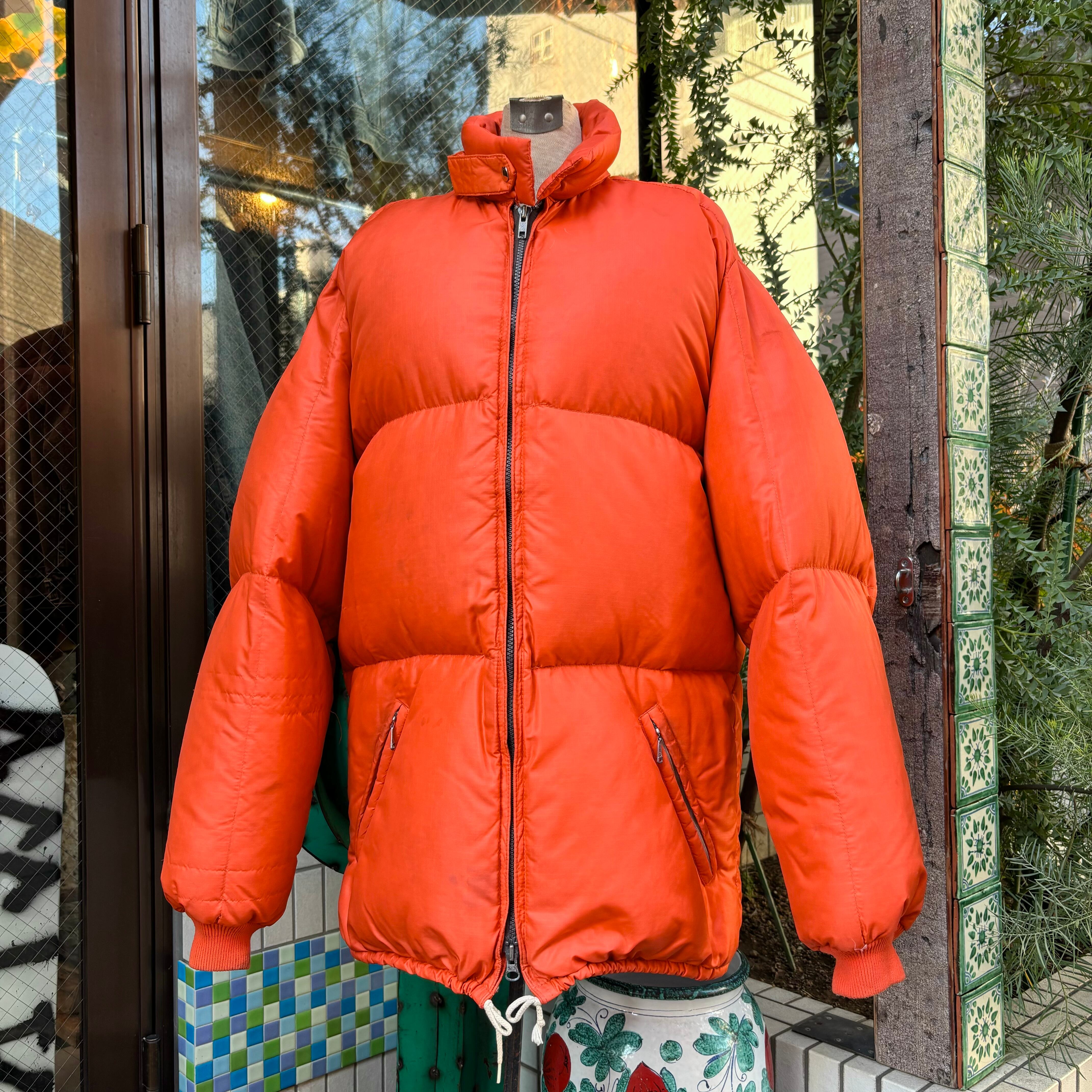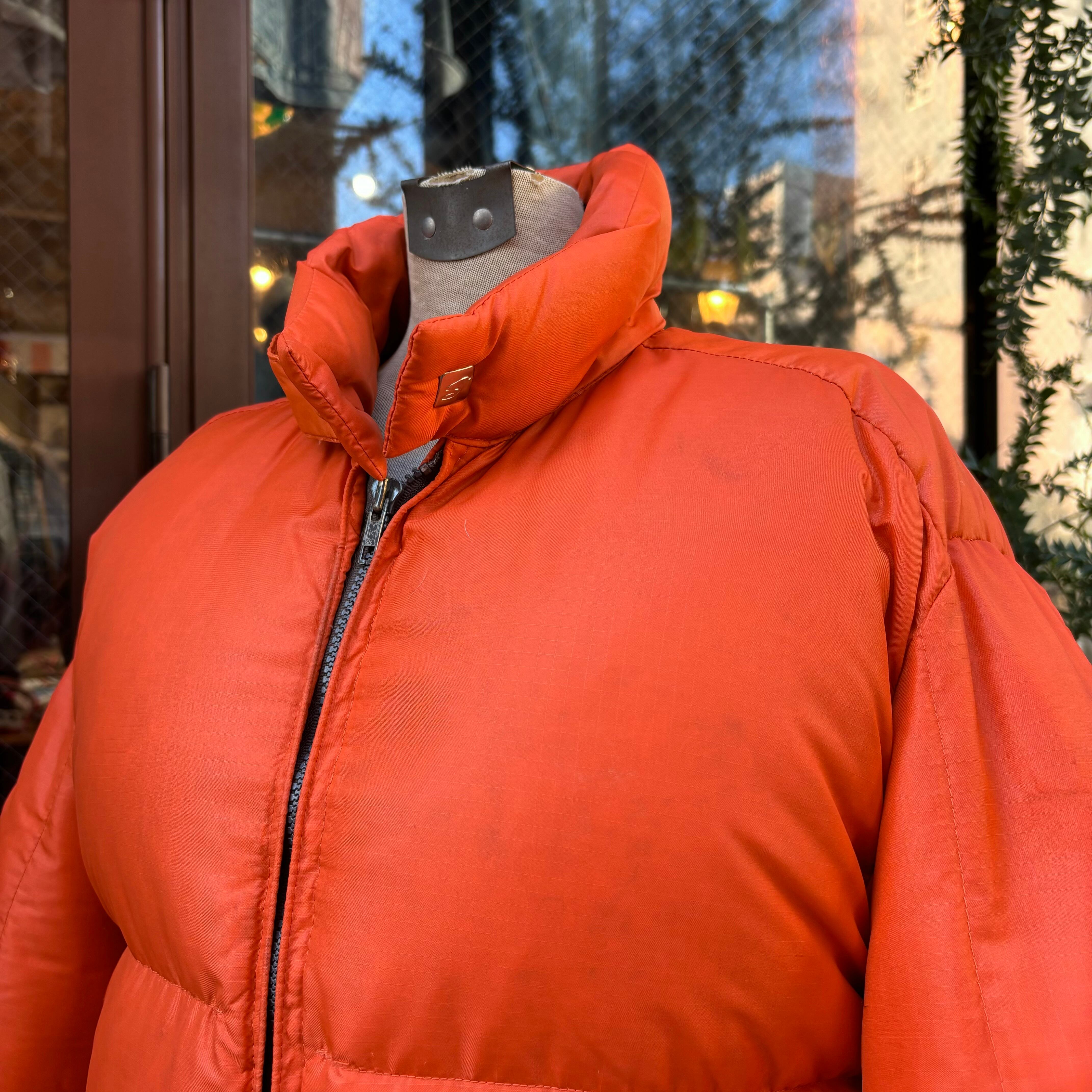 ナイロンシェルに、ダウンの中綿入り。程よくゆとりのあるシルエット。ネックにストラップが付くスタンドカラーに、通称「涙TALON」ジップが付くポケット仕様のクラシカルスタイルのビンテージダウン。アウトドア感のあるオレンジのリップストップ生地に、袖リブ、YKKのダブルスライダーなどOLD感を楽しめるディテール。裾のドローコードも残る悪くないコンディション。女性におすすめのダウンです。