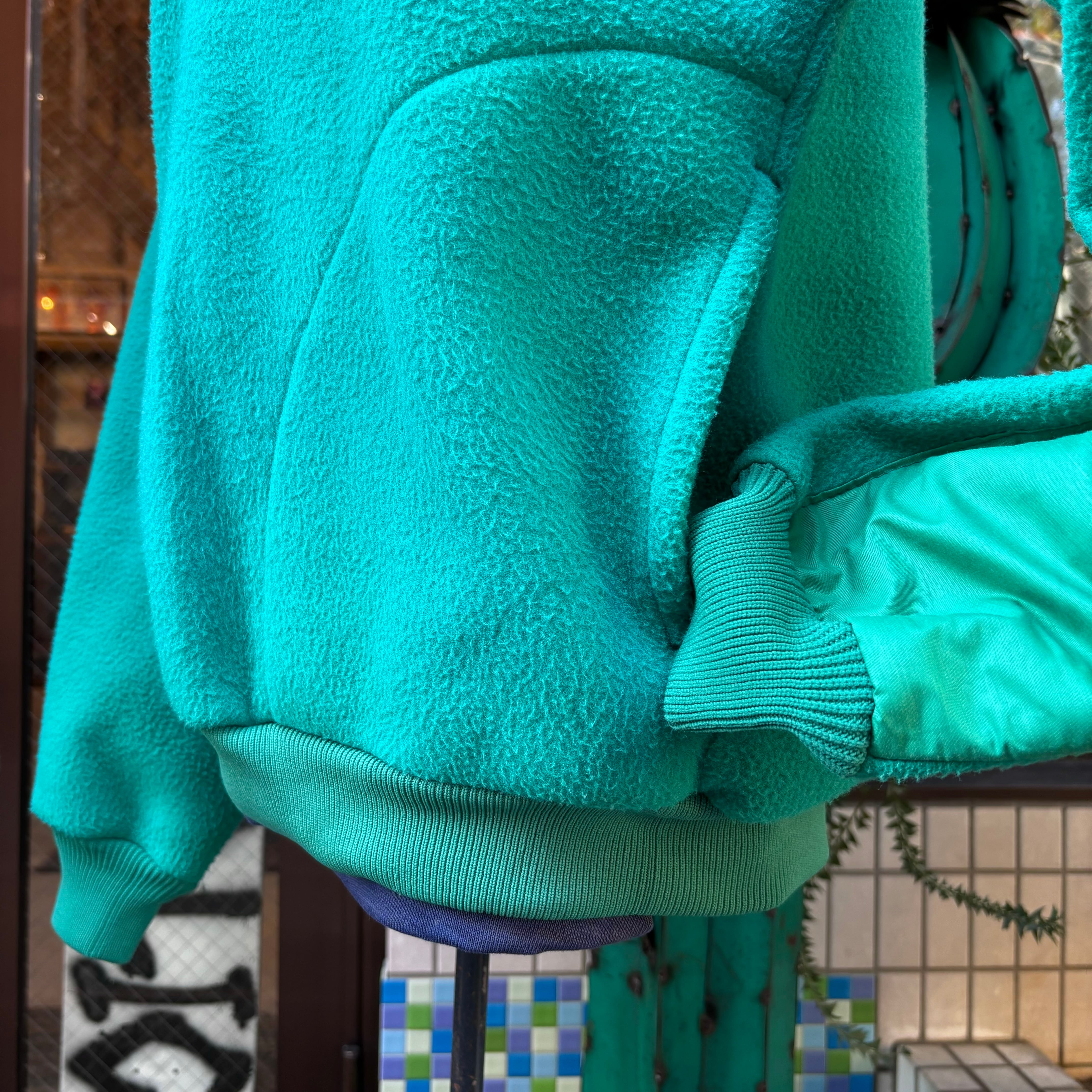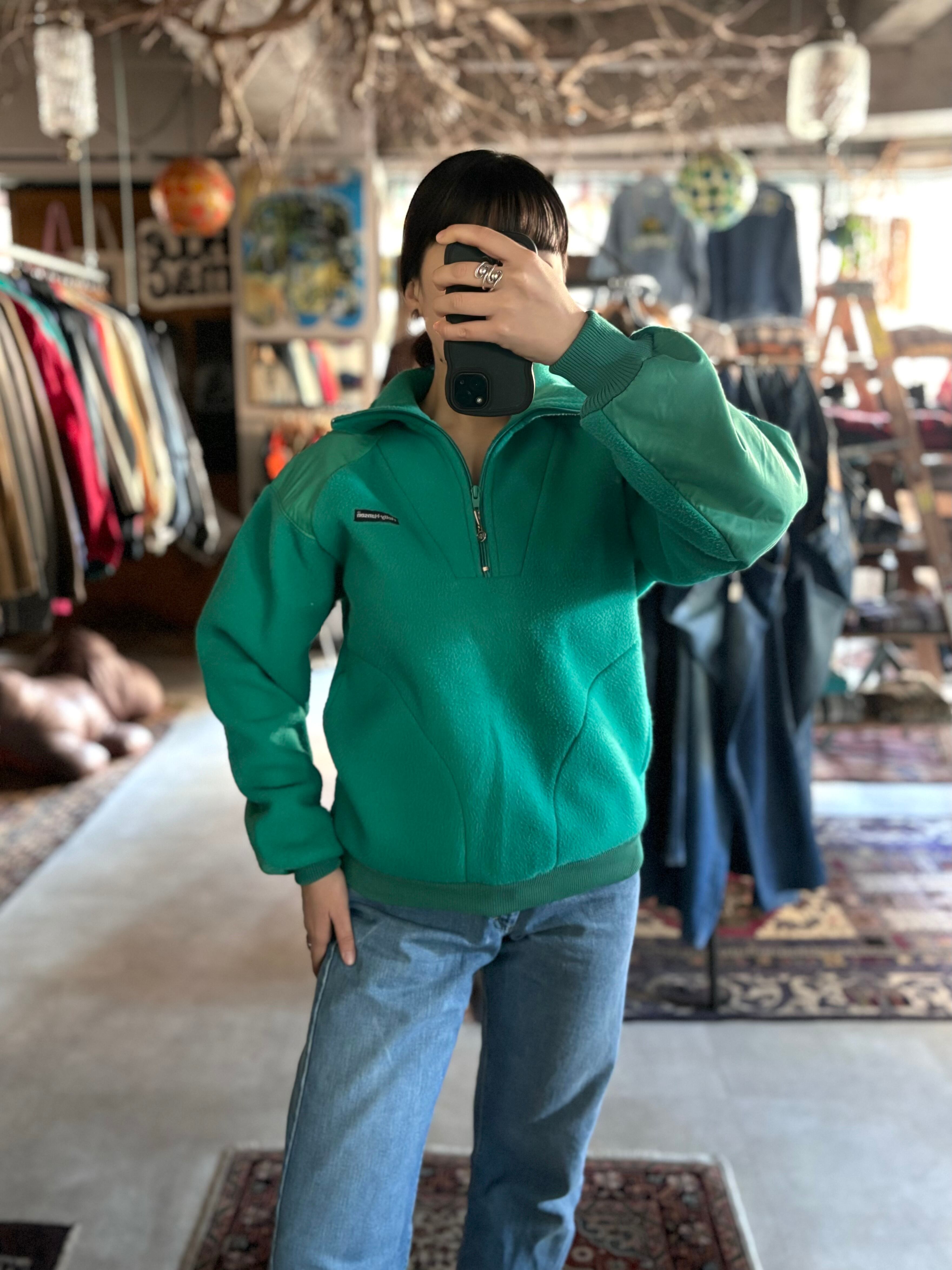 しっかりとした厚みのあるフリース生地。ウエストリブが効いたオールド感のあるシルエット。ラグランスリーブに、ハーフジップのプルオーバースタイル。肩、肘裏にはナイロンの当て布つき。USAメイドのビンテージHELLEY HANSEN。さほど着用感もなく、ジップのチャームが残る良好なコンディション。OLDアウドドアの雰囲気抜群の1着。