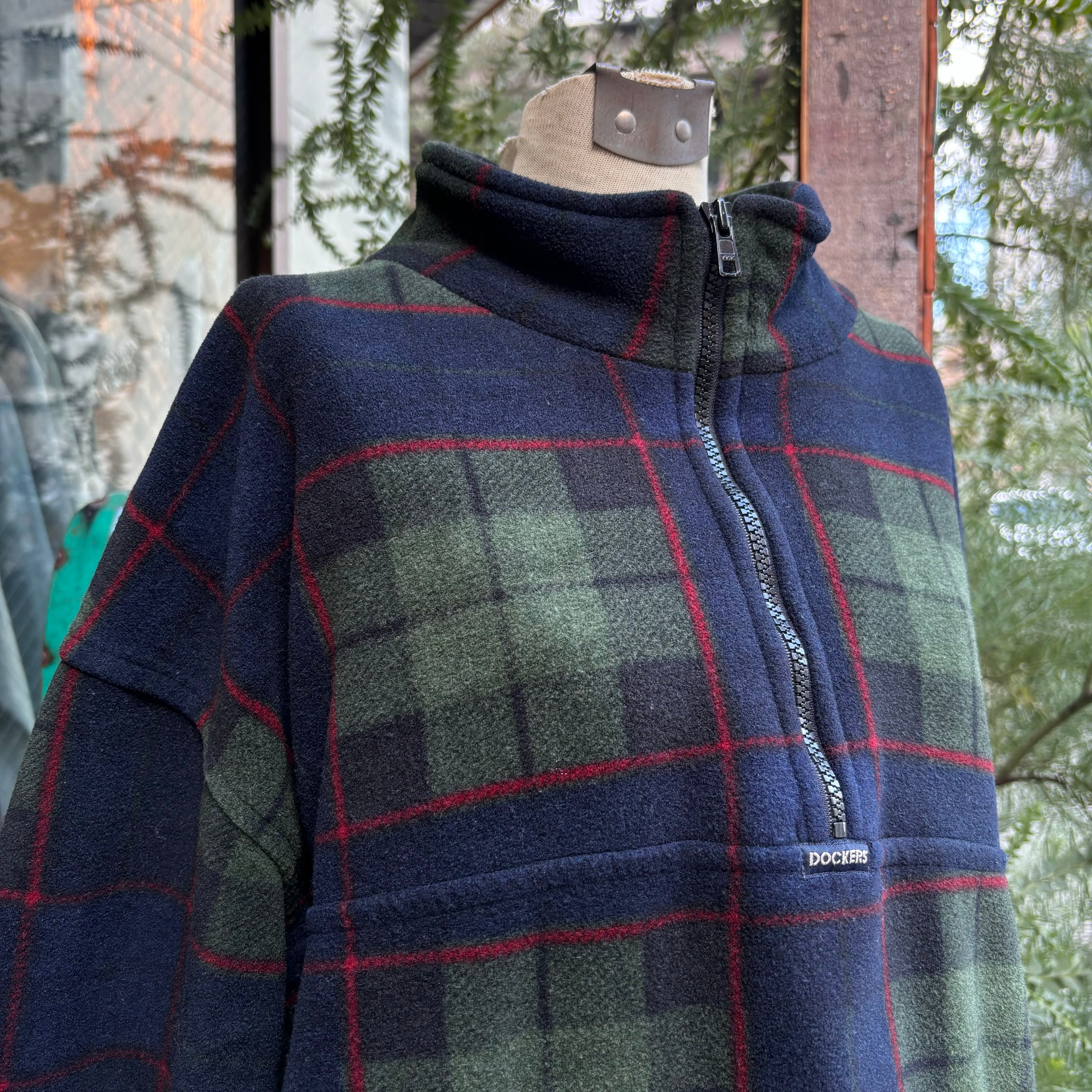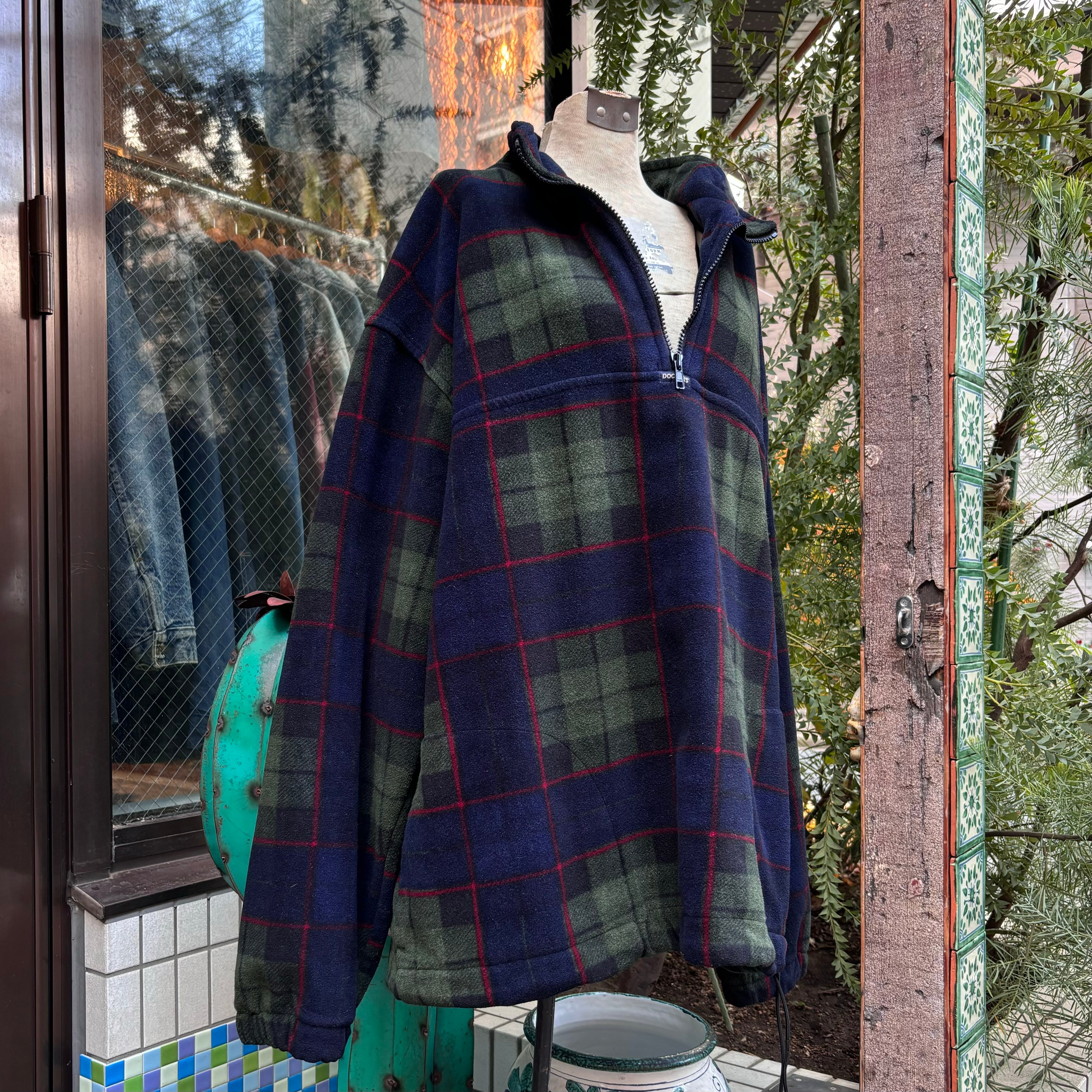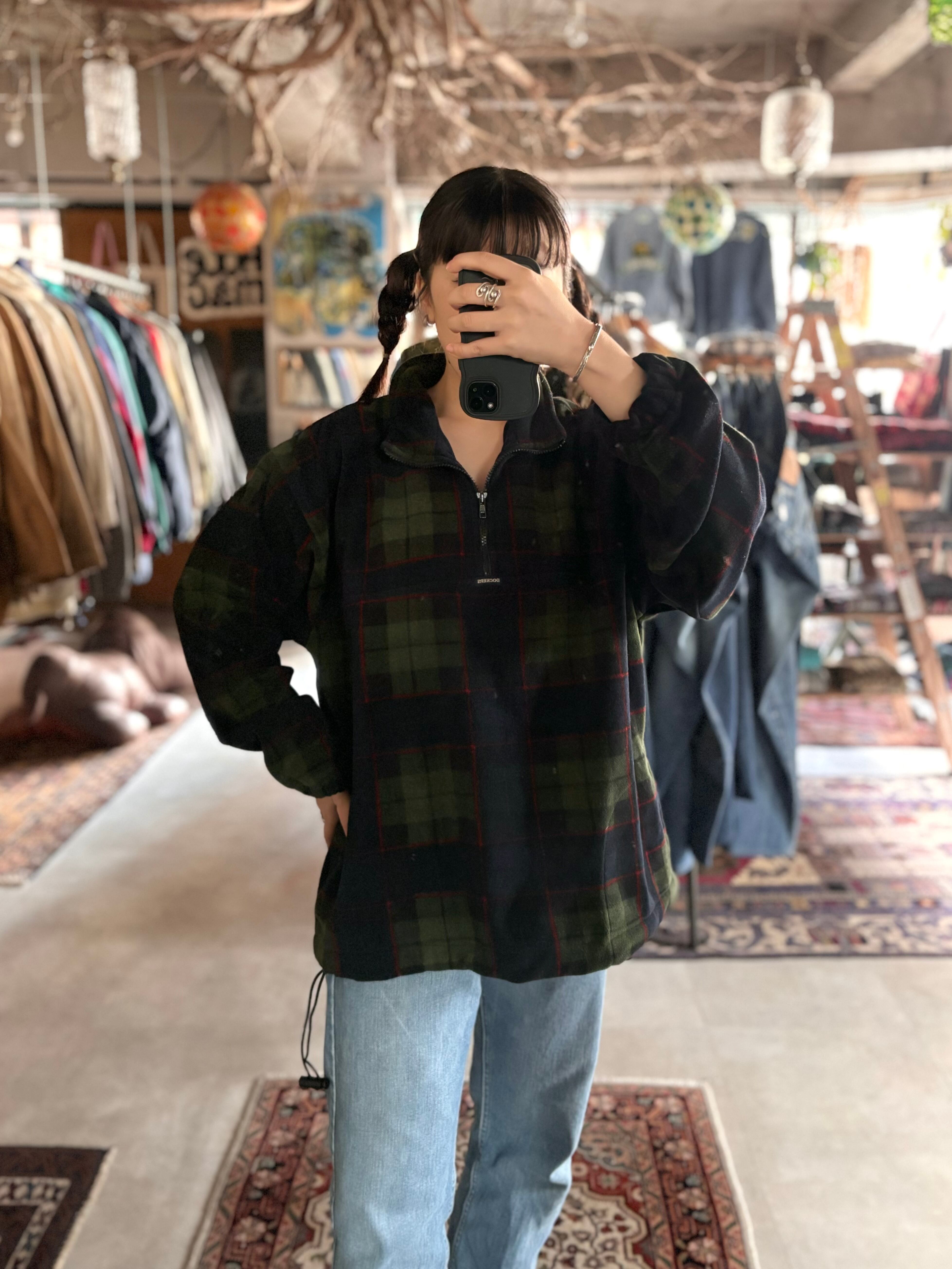 軽く着心地の良いフリース生地。ゆとりのあるリラックスフィット。トラディショナルな色調のダークトーンチェック。インナーとしても、トップスとしても映えるスタンドカラーのハーフジップデザイン。USAメイドのOLD DOCKERS製。
