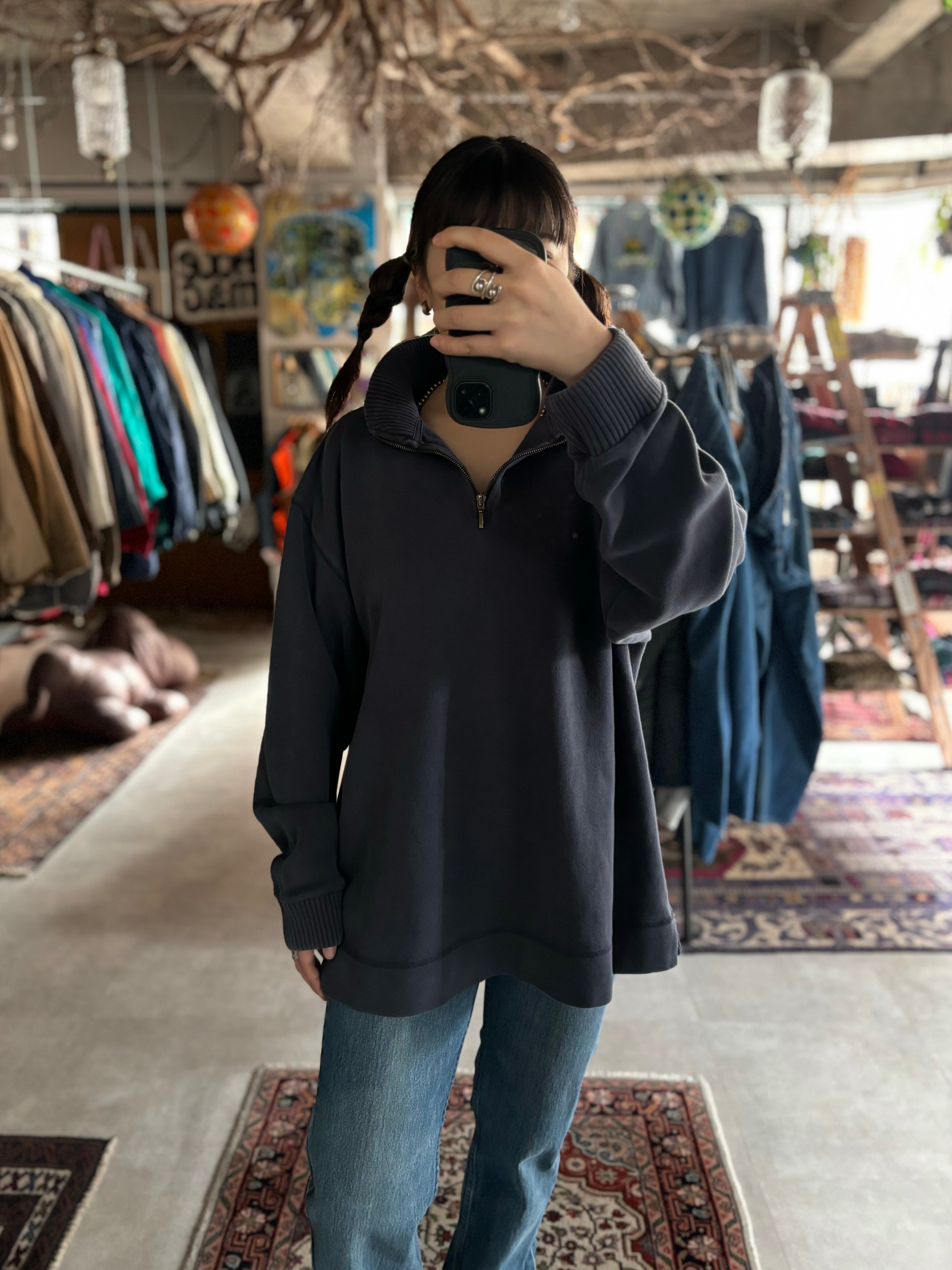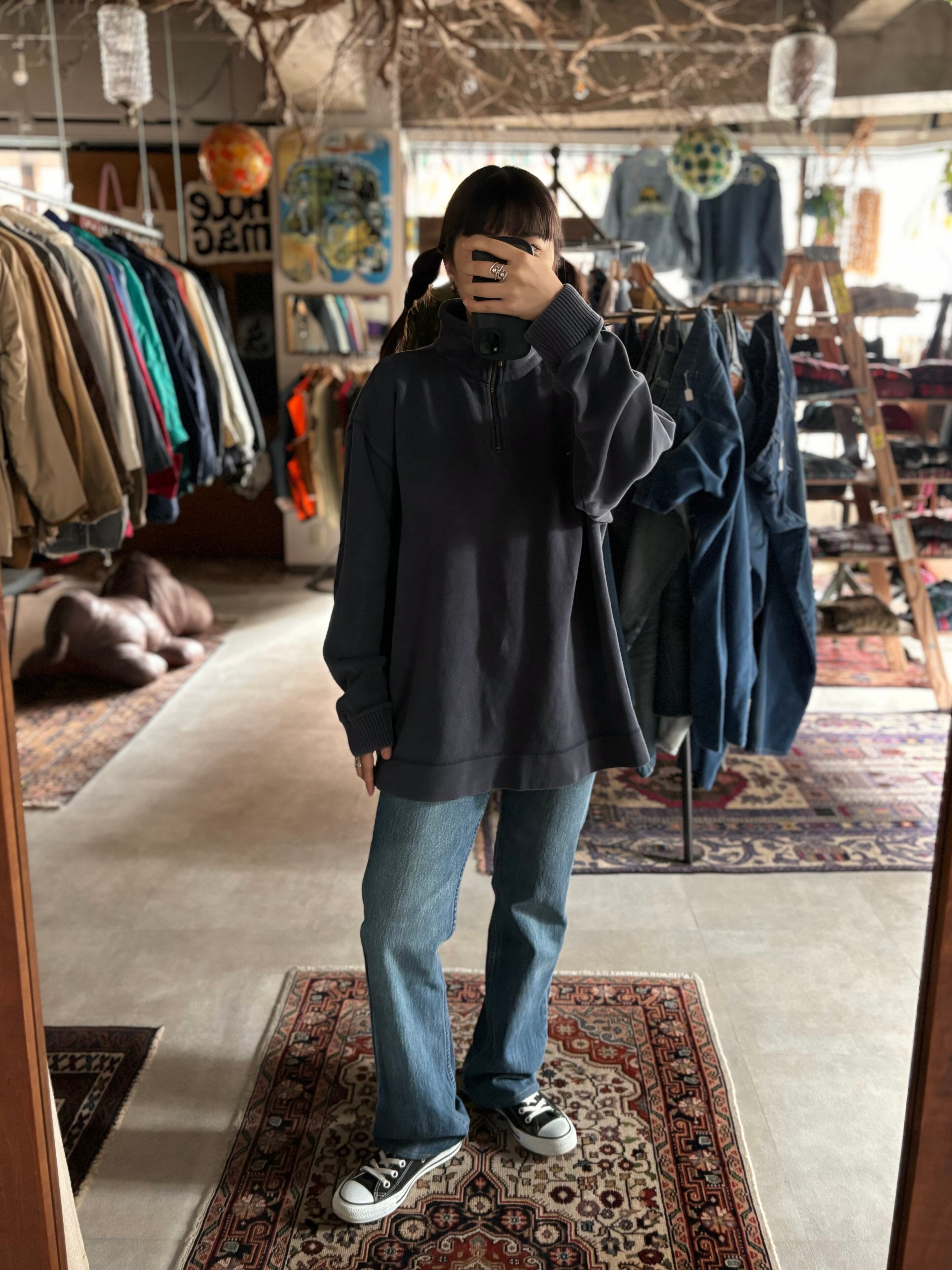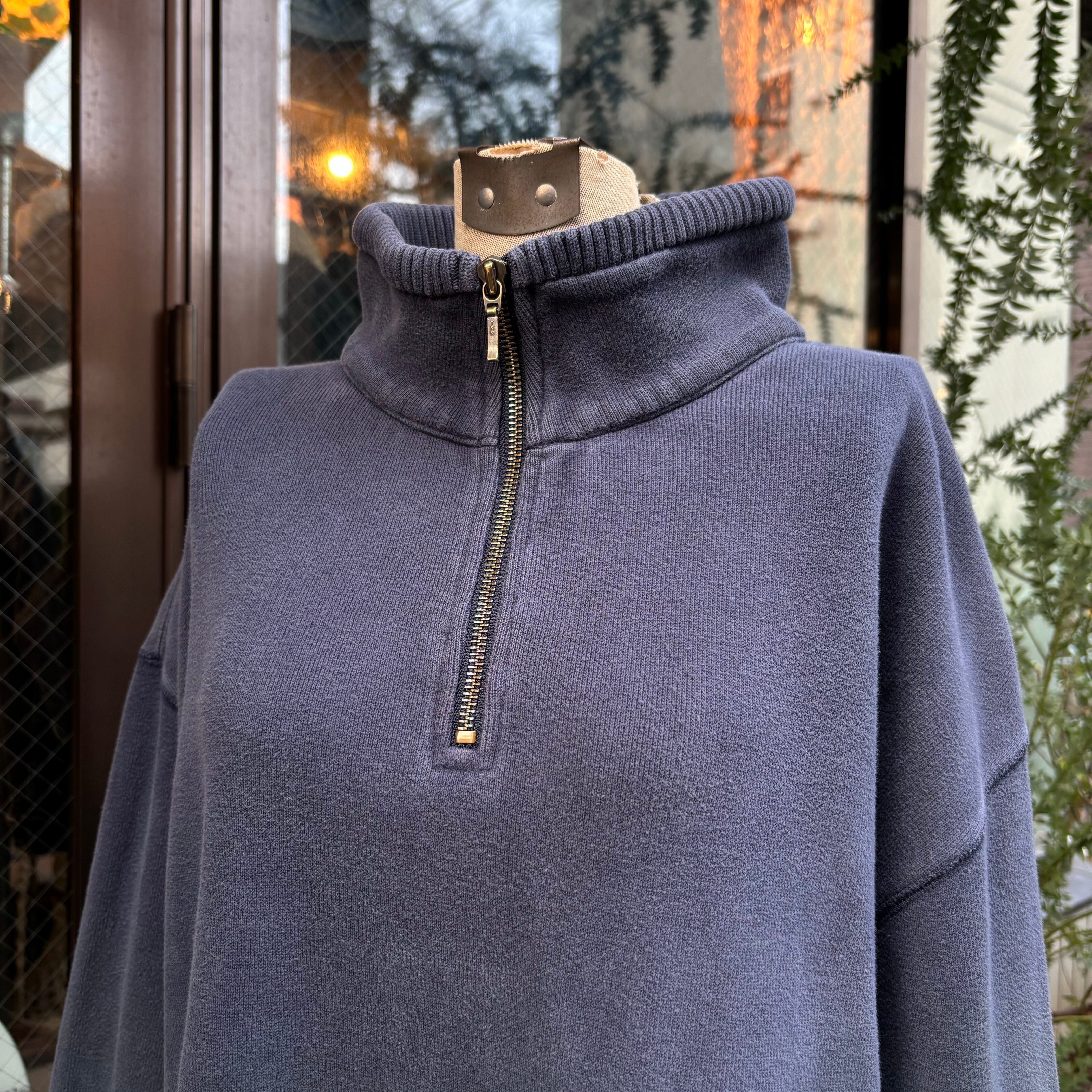 しっかりした厚みのスウェット素材。身幅と着丈のバランスが変わらないルーズな正方形シルエット。分厚いがっちりしたリブに、裾にはスリット入り。お洒落感のあるハーフジップ仕様。ひねりのあるデザインが多いJAMAICAメイドのOLDビーン。クールな印象のおすすめの1着。