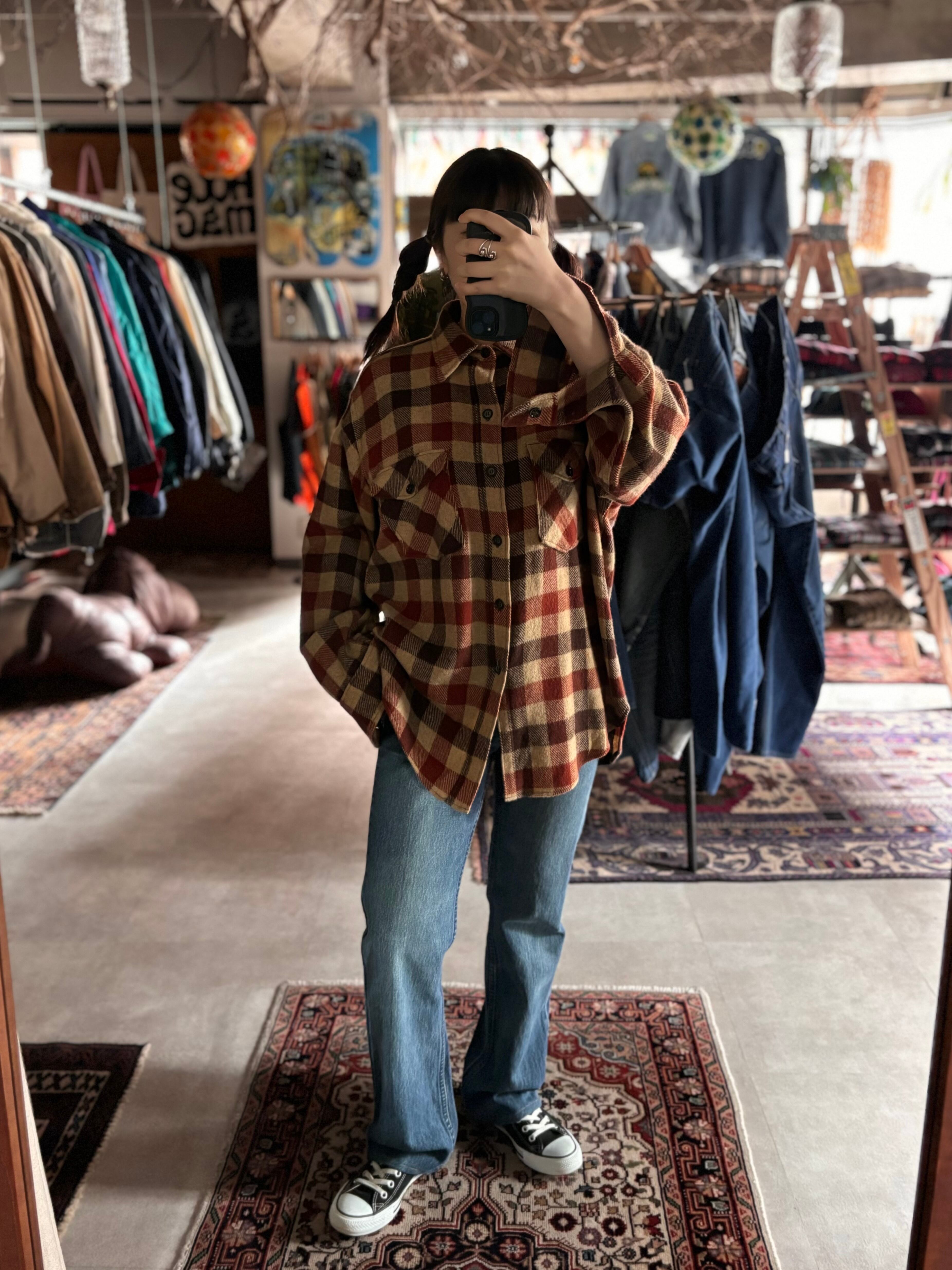 しっかりした厚みのウール素材。ゆとりのあるリラックスシルエット。秋冬の街並みに抜群に映えるキャメルカラーベースのチェック。可愛い大きめのフラップポケット。フーディーやニットに上に重ねる準アウターとして、とても使い勝手の良い1枚。大人におすすめの良質ウールシャツです。