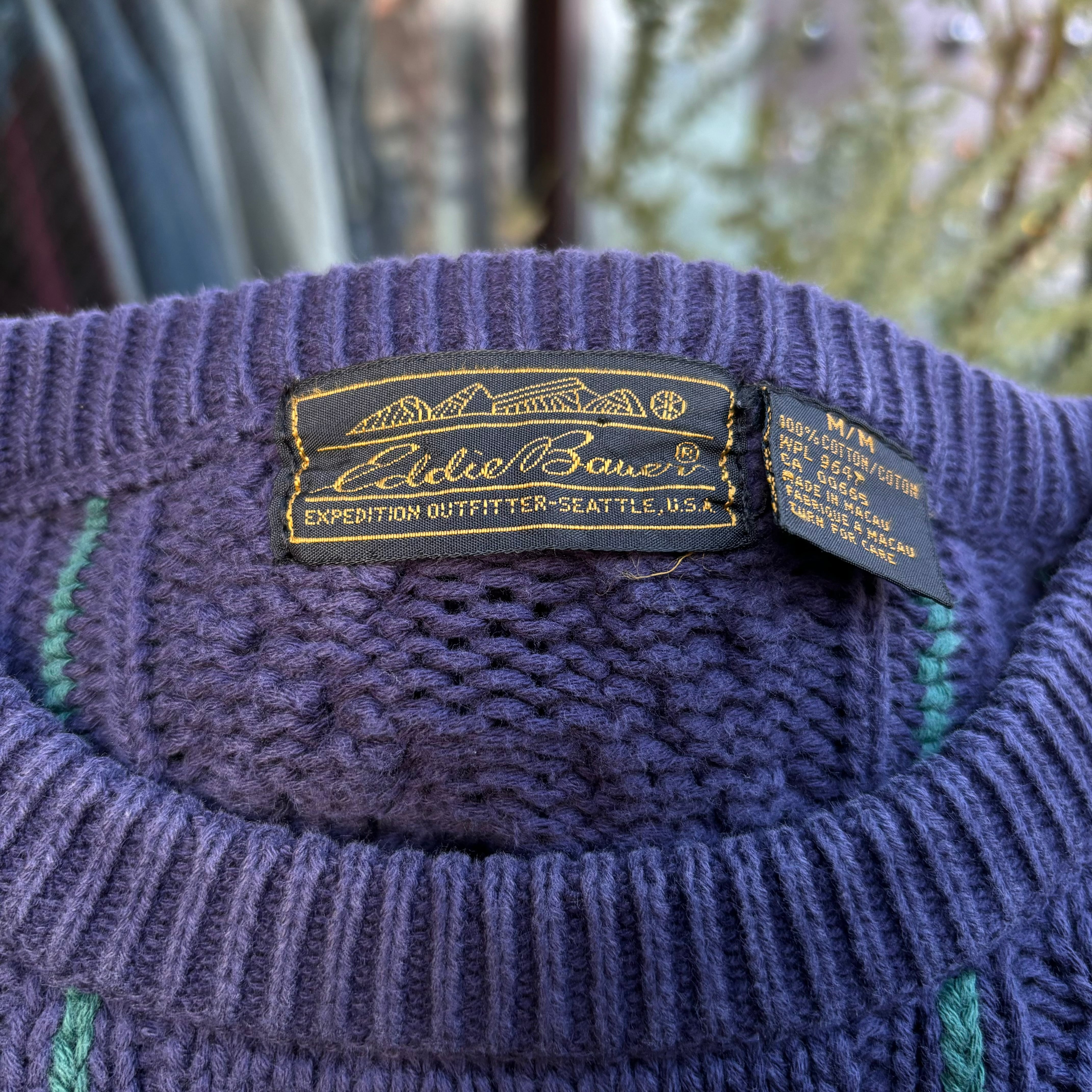 しっかりした厚みにコットンニット。ゆとりのあるリラックスフィット。色褪せたネイビーカラーに、グリーンのライン入り。黒タグの付くビンテージEddie Bauer製。カジュアルなラフさと、さりげない品の良さを楽しめる1着。