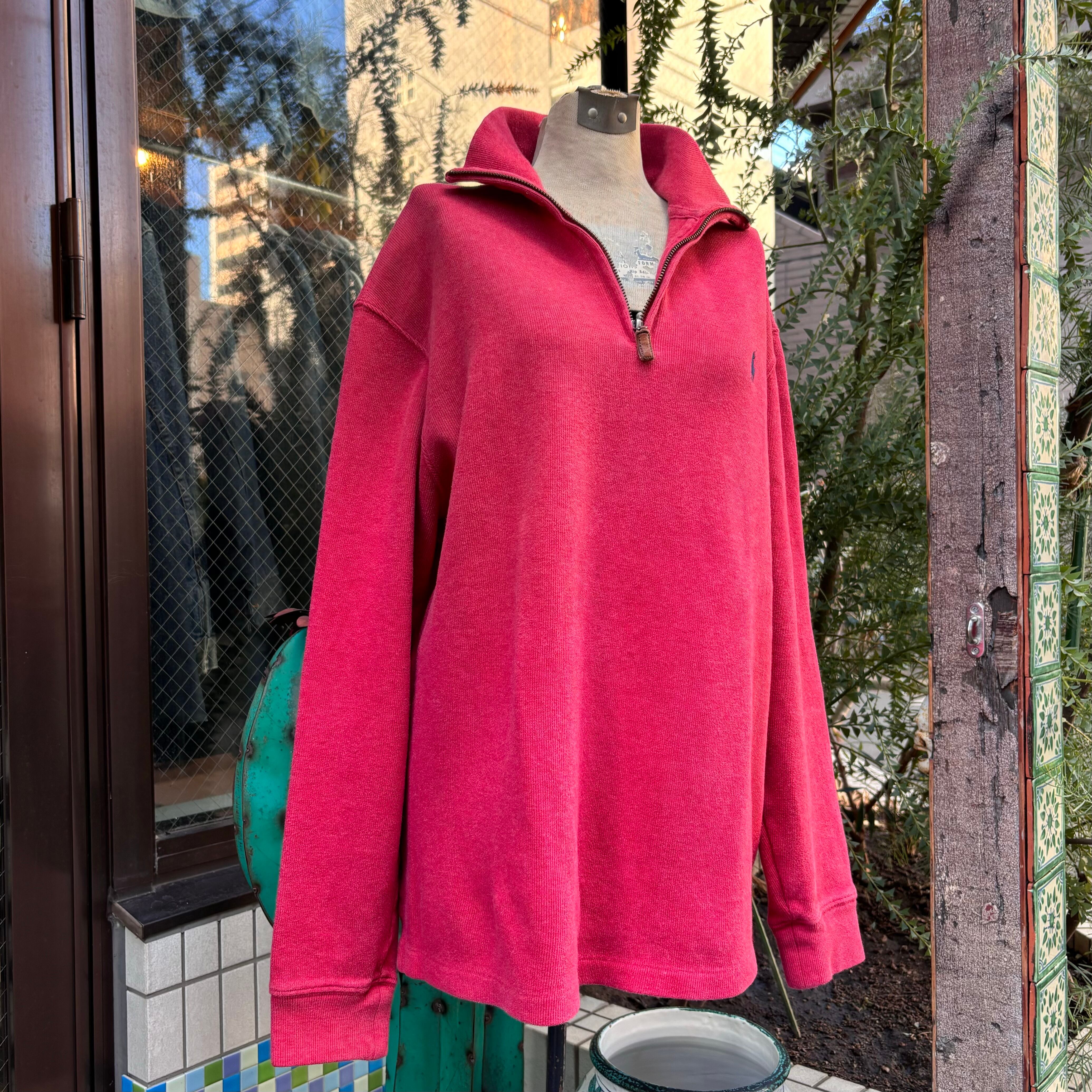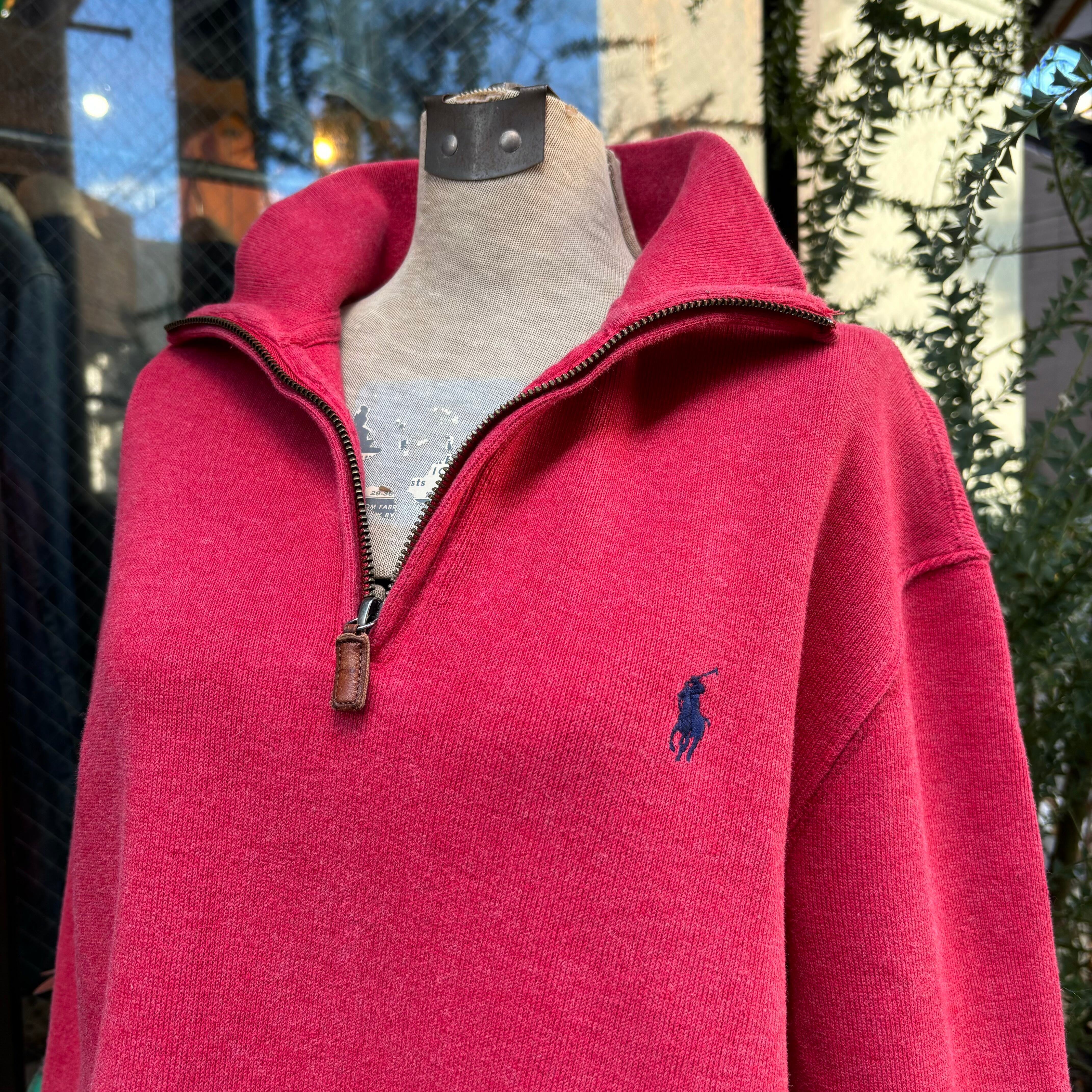 しっかりした厚みのコットン素材。程よくゆとりのあるシルエット。ウォッシュドがかったレッドカラーに、ネイビーのポニー刺繍。襟を立てたり、寝かせたり気分の着こなしを楽しめる高めのネックのハーフジップ仕様。スタンダードな雰囲気とカジュアルな上質感。古着市場でも近年注目度の上がっているラルフローレンクラシック。