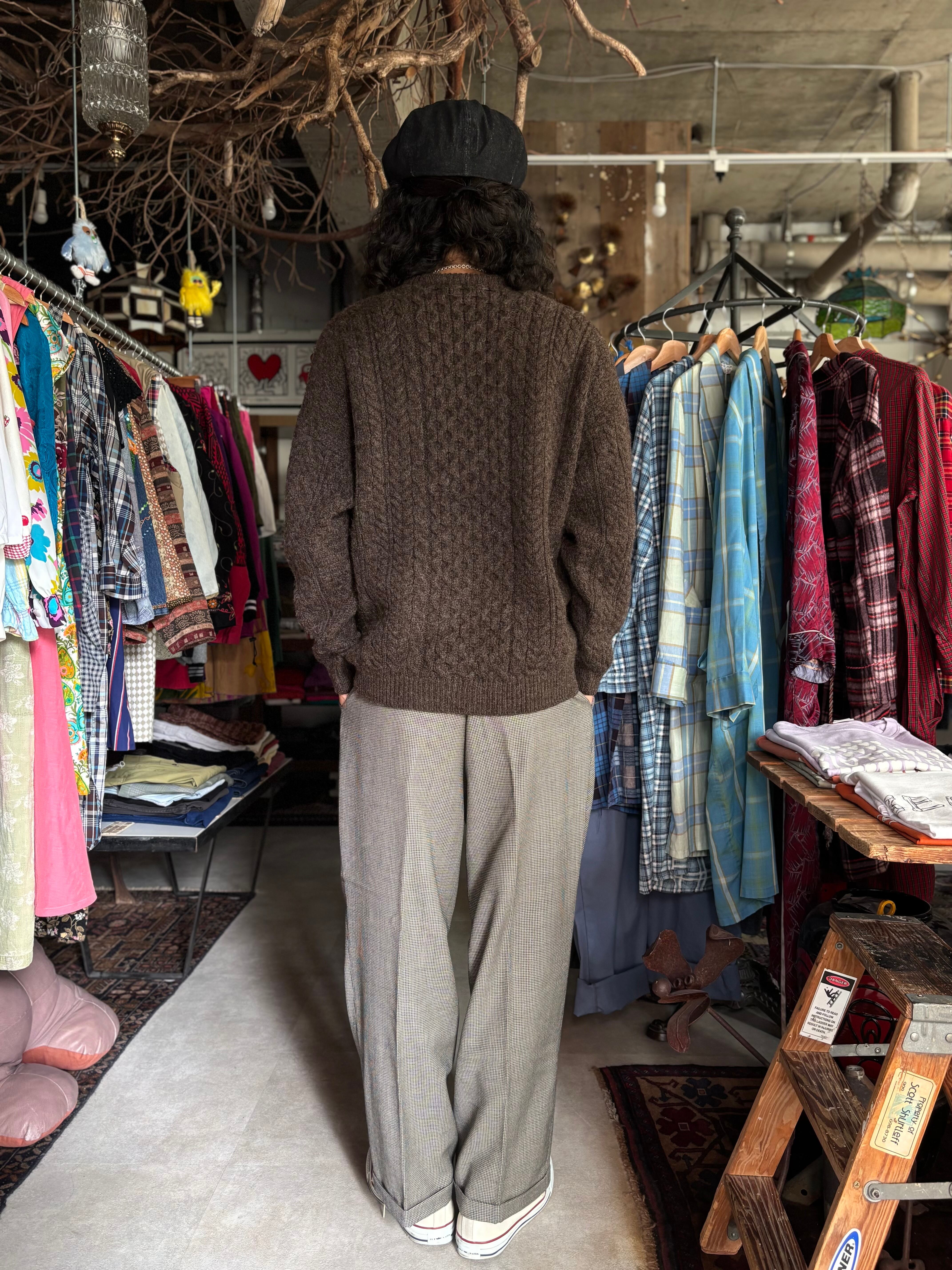 しっかりとした肉厚なウール素材。リラックスフィット。落ち着いたトーンのブラウンカラー。クラシカルなアランパターンの編み模様。質の高さが際立つアイルランド製。トレンドに左右されない良品ニット。ユニセックスでおすすめです。