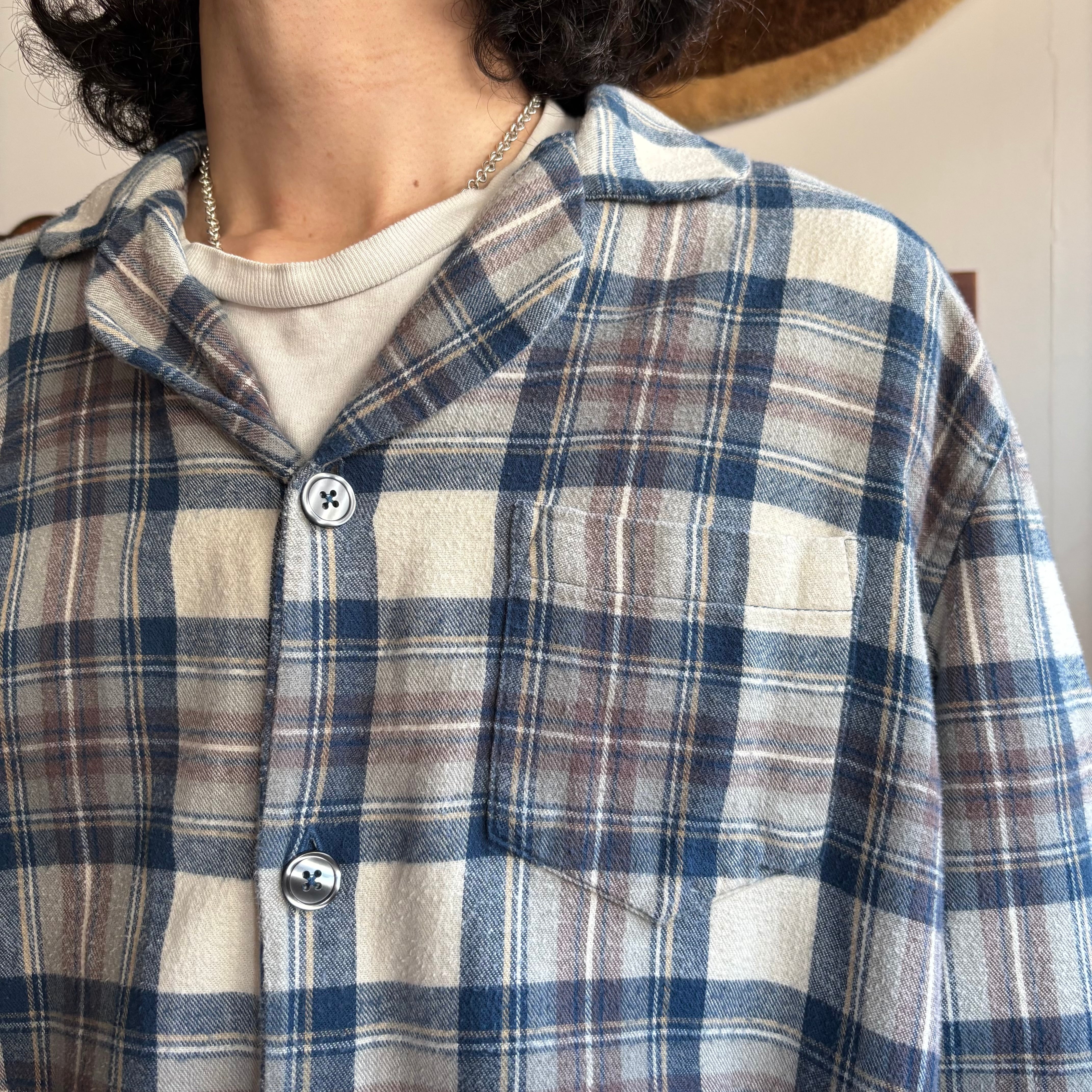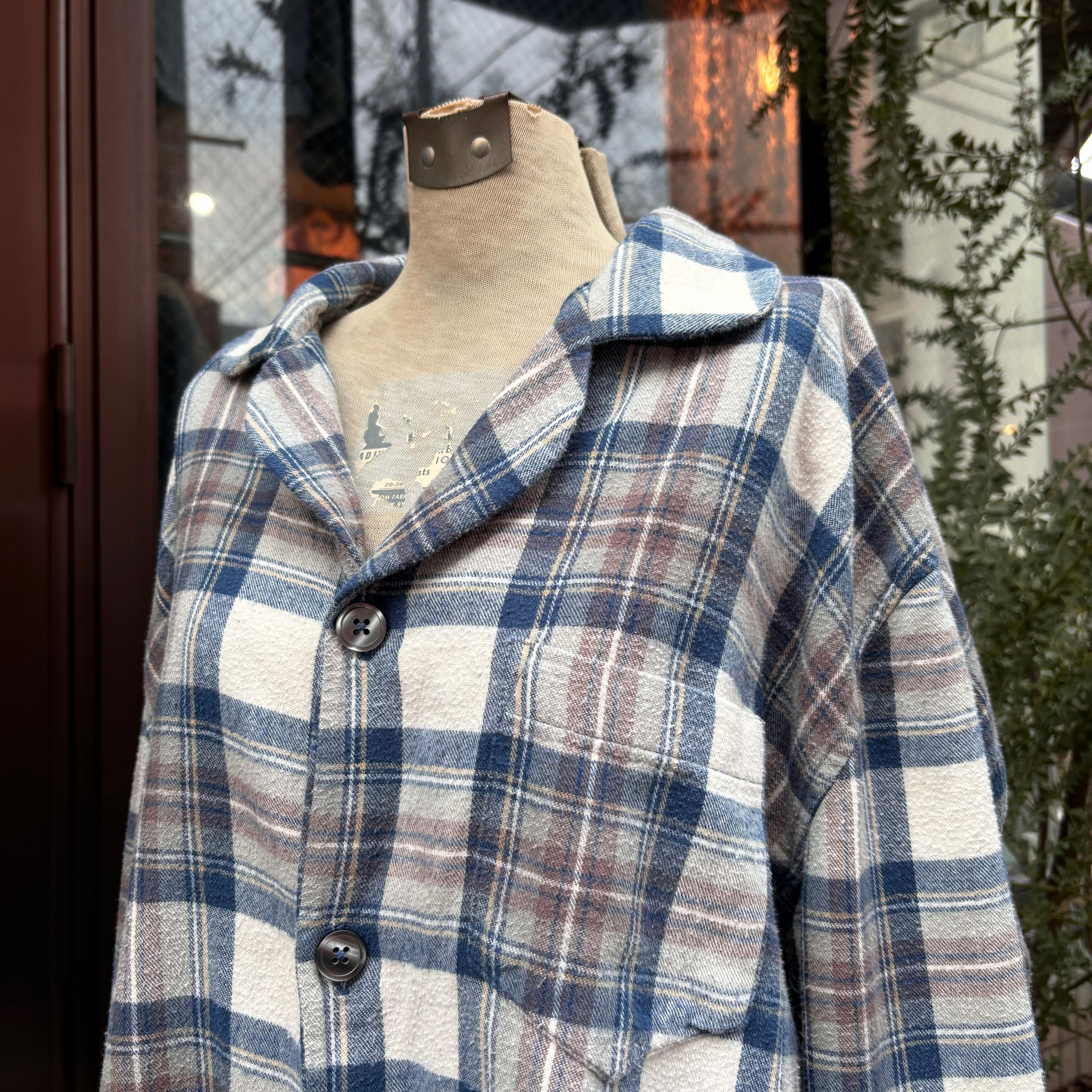 着込まれ柔らかくなったコットンフランネル。ゆとりのあるリラックスフィット。まるみのあるラペルカラーに、淡いトーンのチェックが可愛さ抜群。バサッと羽織るのに使い易いシルエット。トップスとしてとても映える可愛いデザイン。