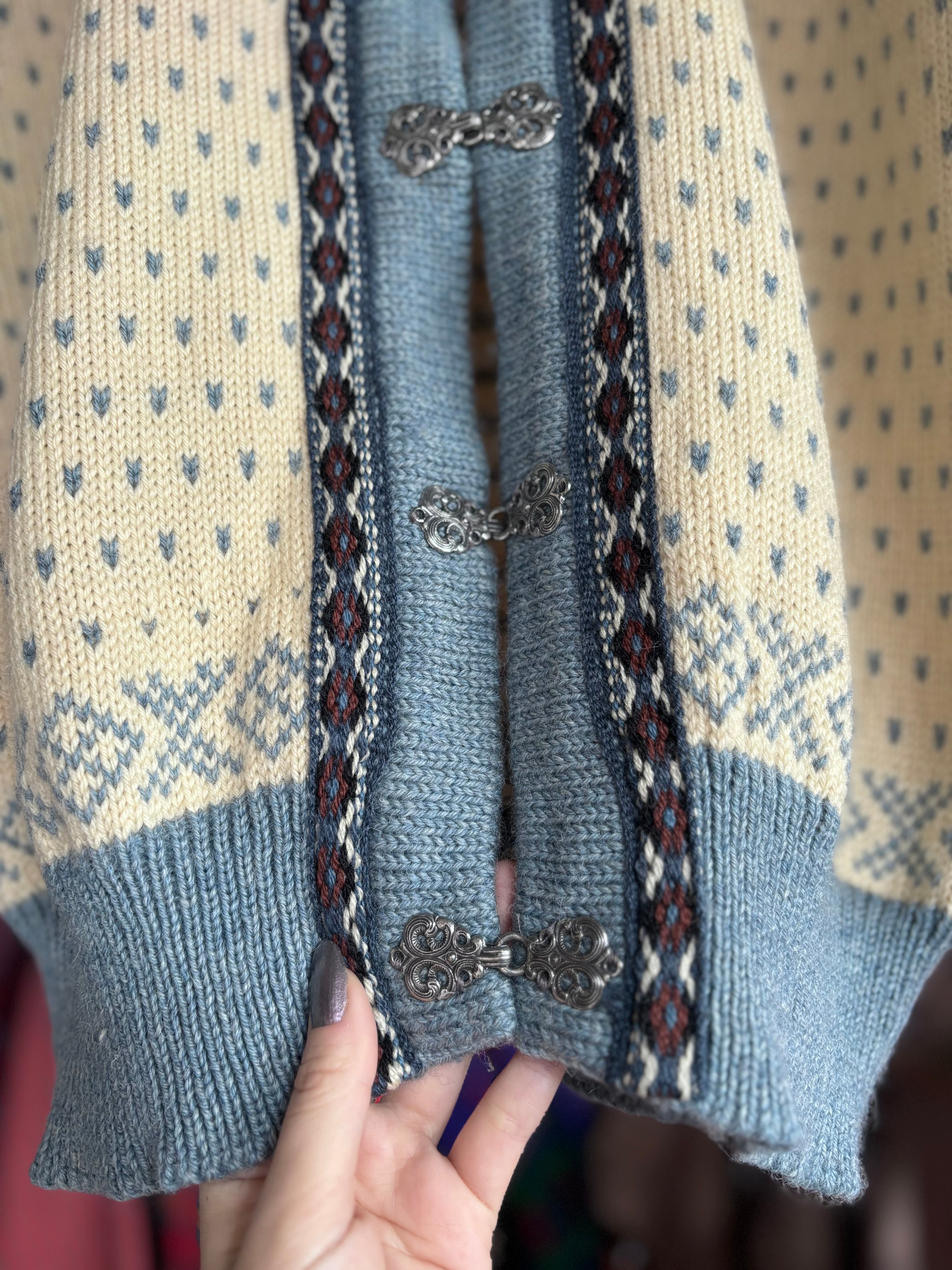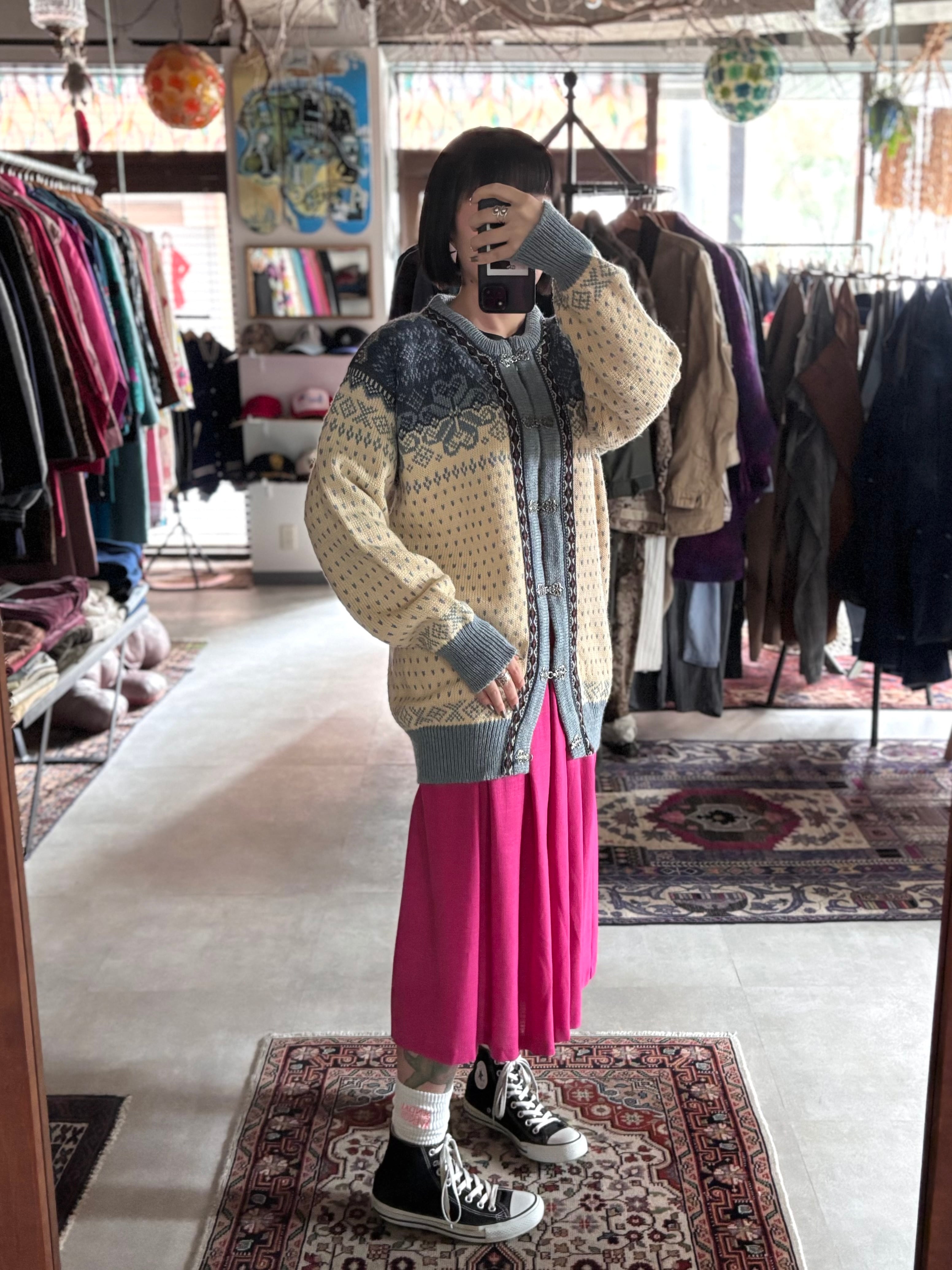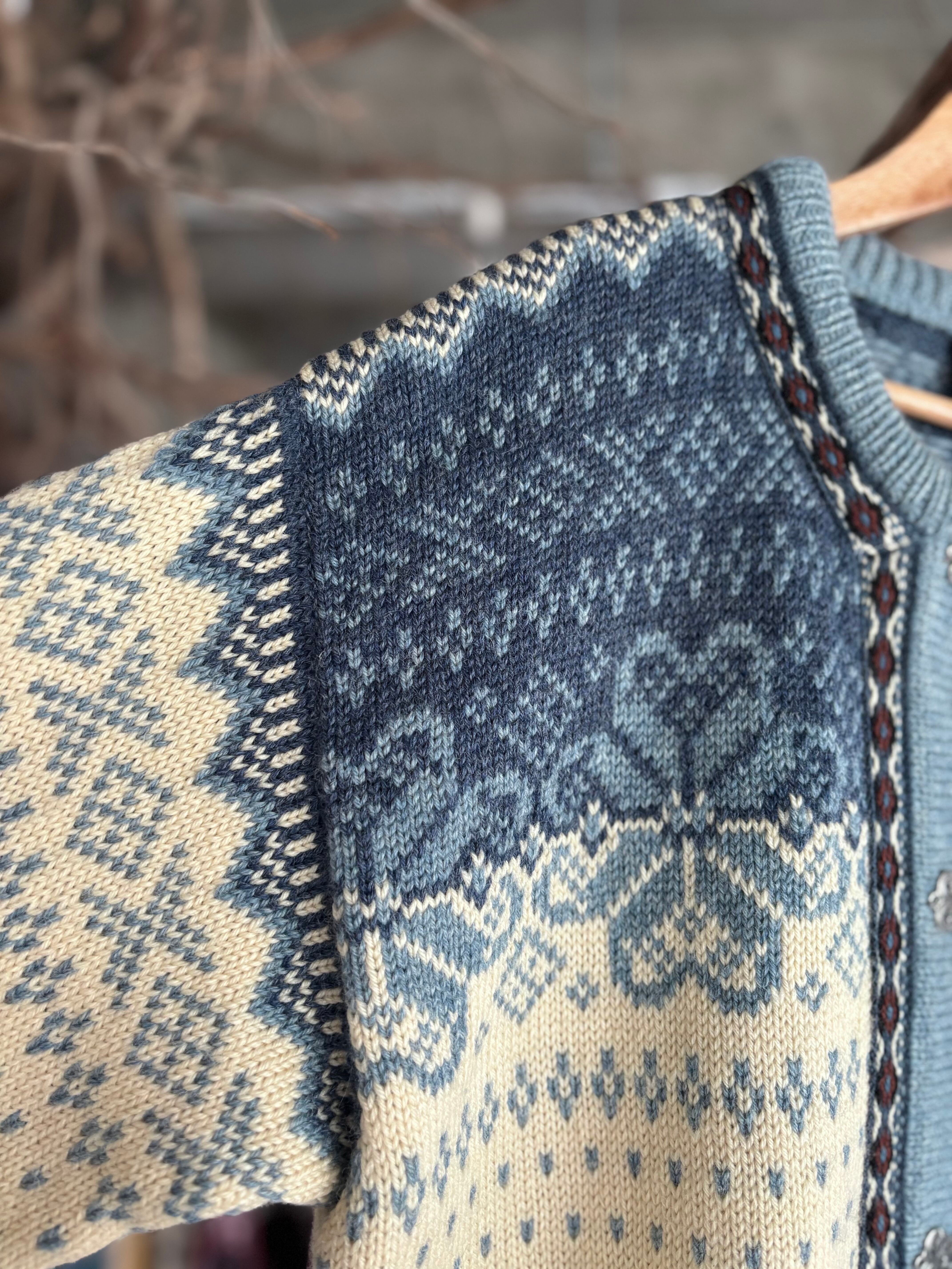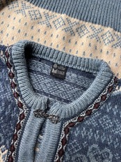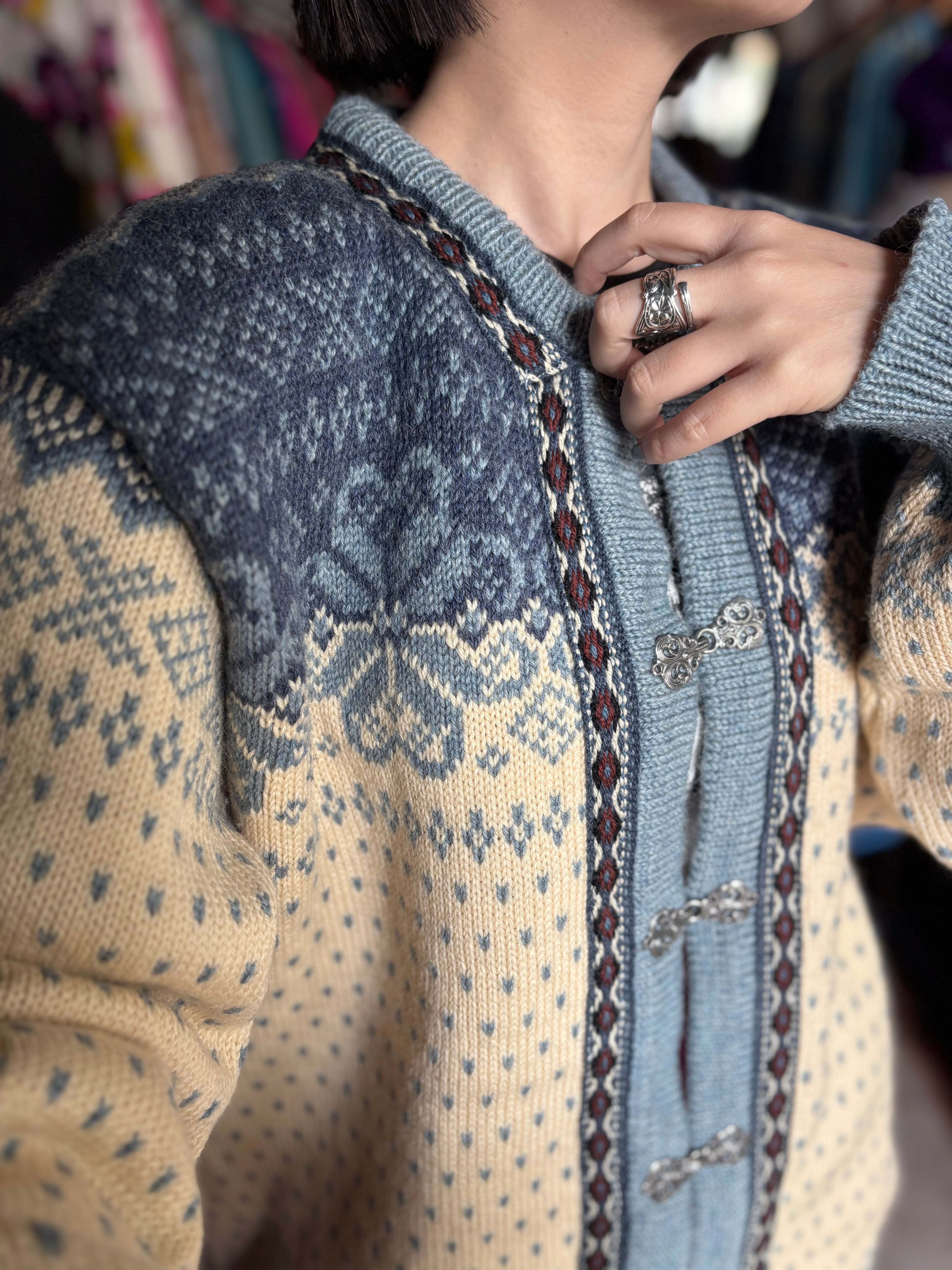 しっかりした厚みのウール素材。程よくゆとりのあるシルエット。老舗ブランドのDALE OF NORWAY製。存在感のあるメタルフックのカーディガンタイプ。