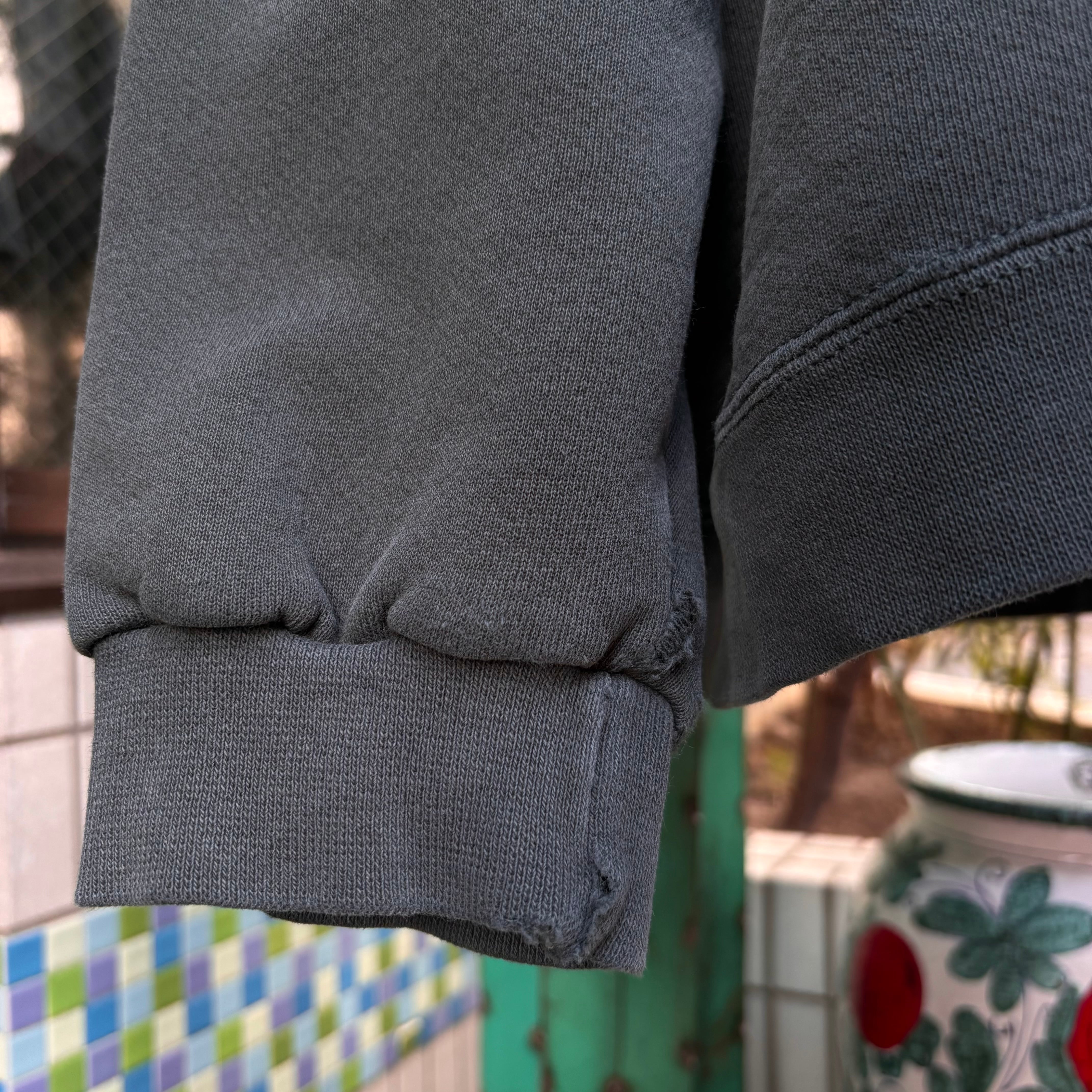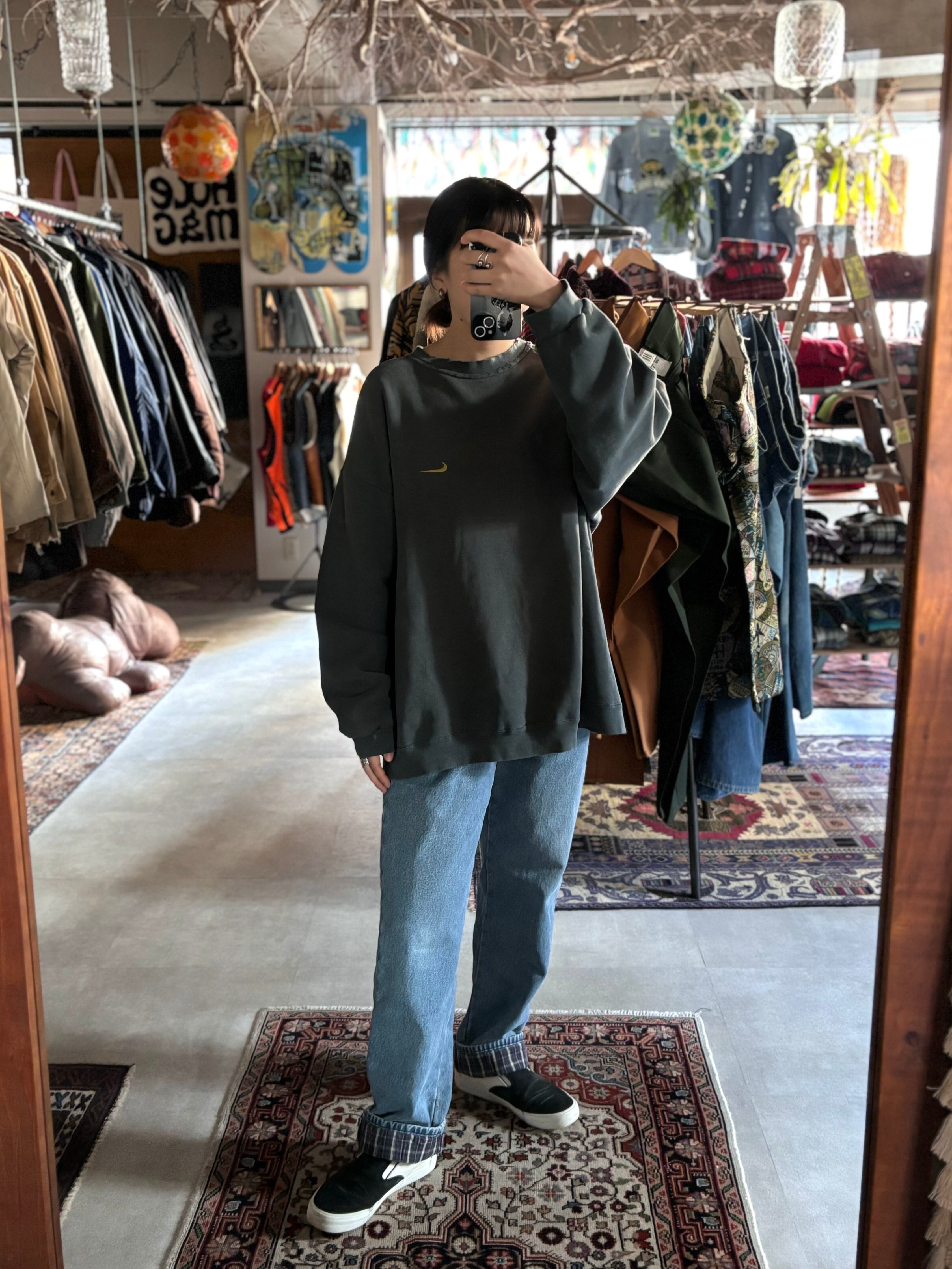 着込まれ柔らかくなったコットン素材。たっぷりしたルーズフィット。USA製のビンテージ NIKE。古着市場でも評価の上がってきているシンプルなスウォッシュロゴタイプ。チャコールベースに、ライムグリーンのクールな配色。色褪せや経年含め、切れ味抜群のカッコよさ。