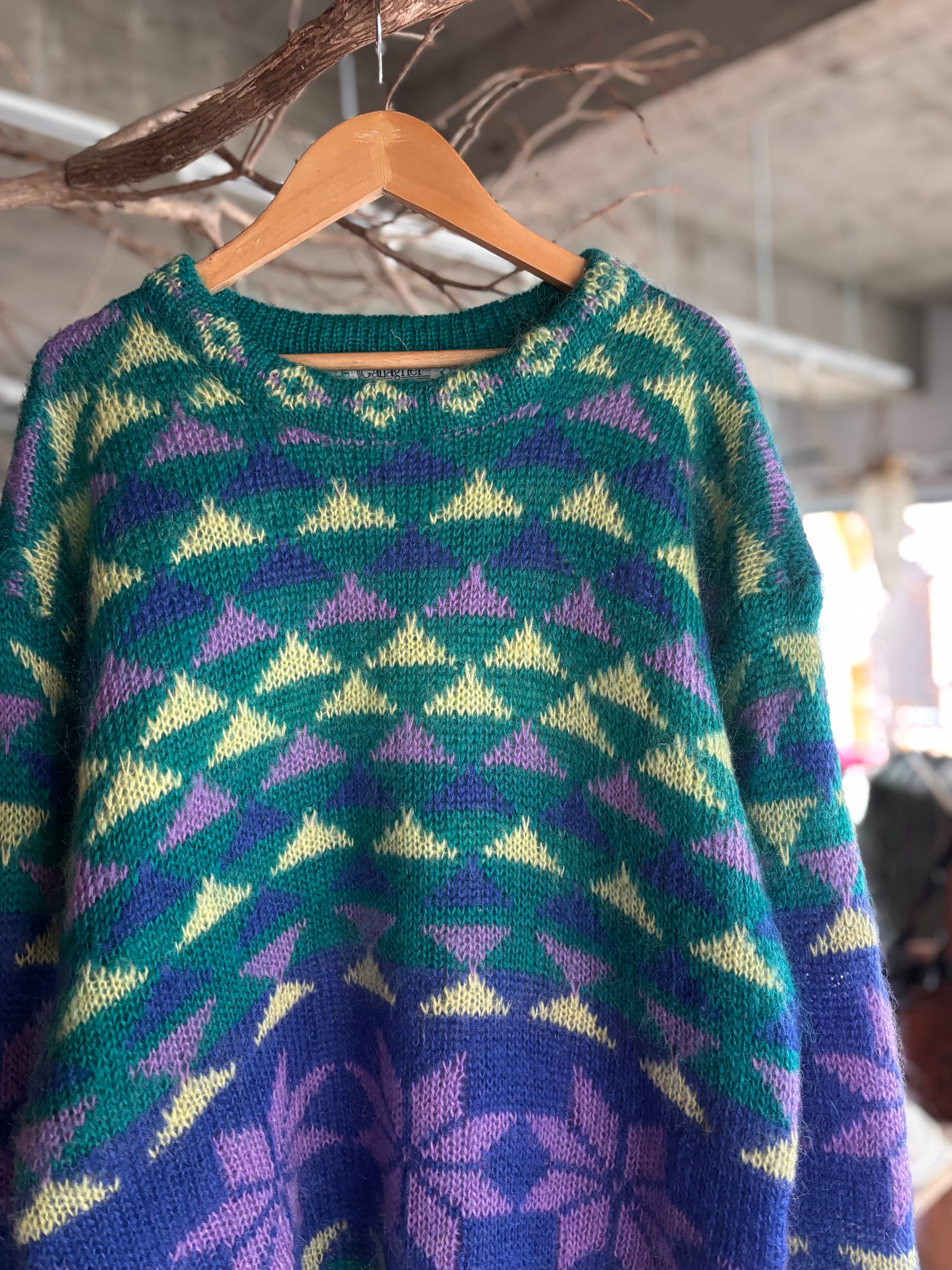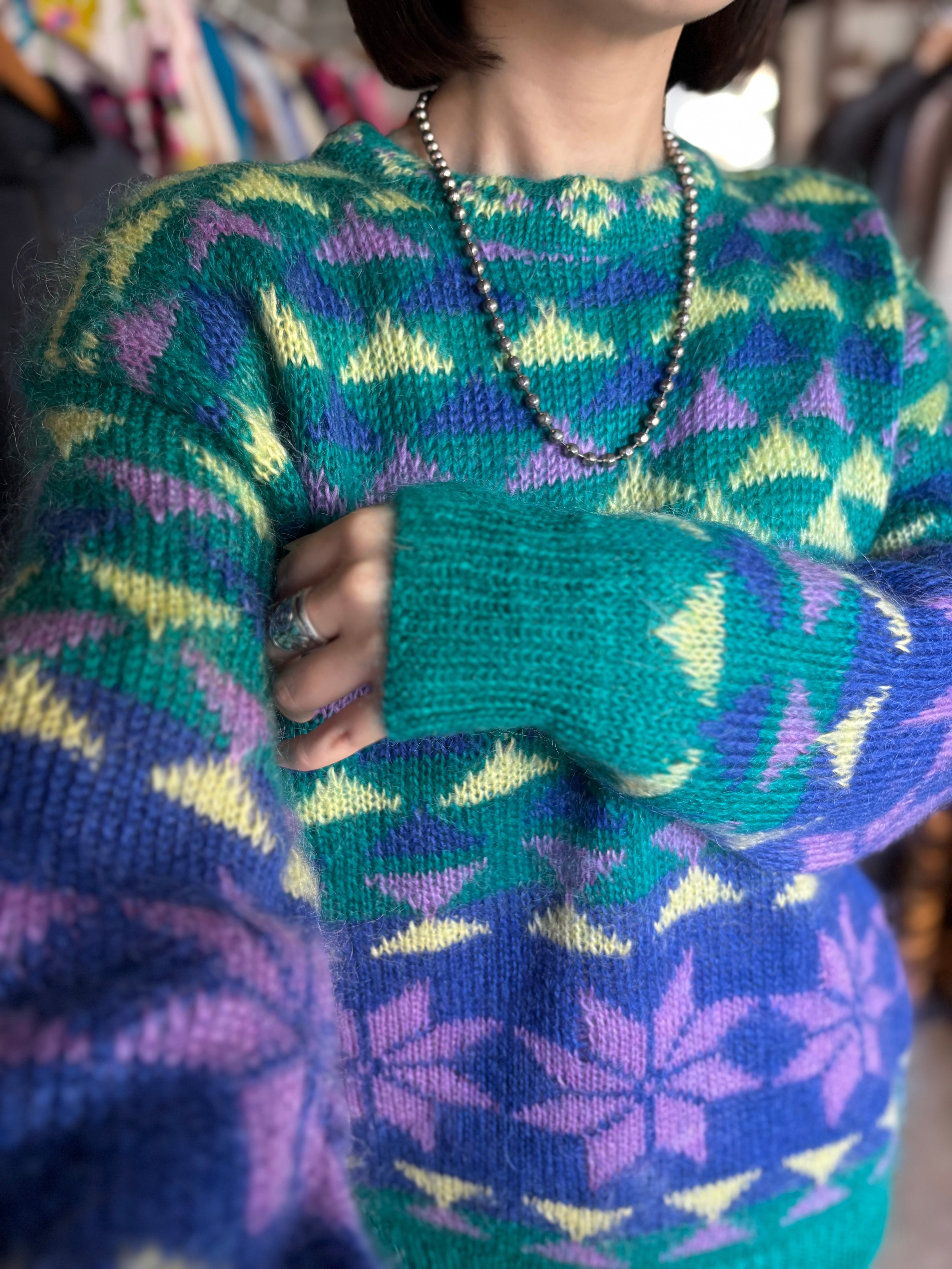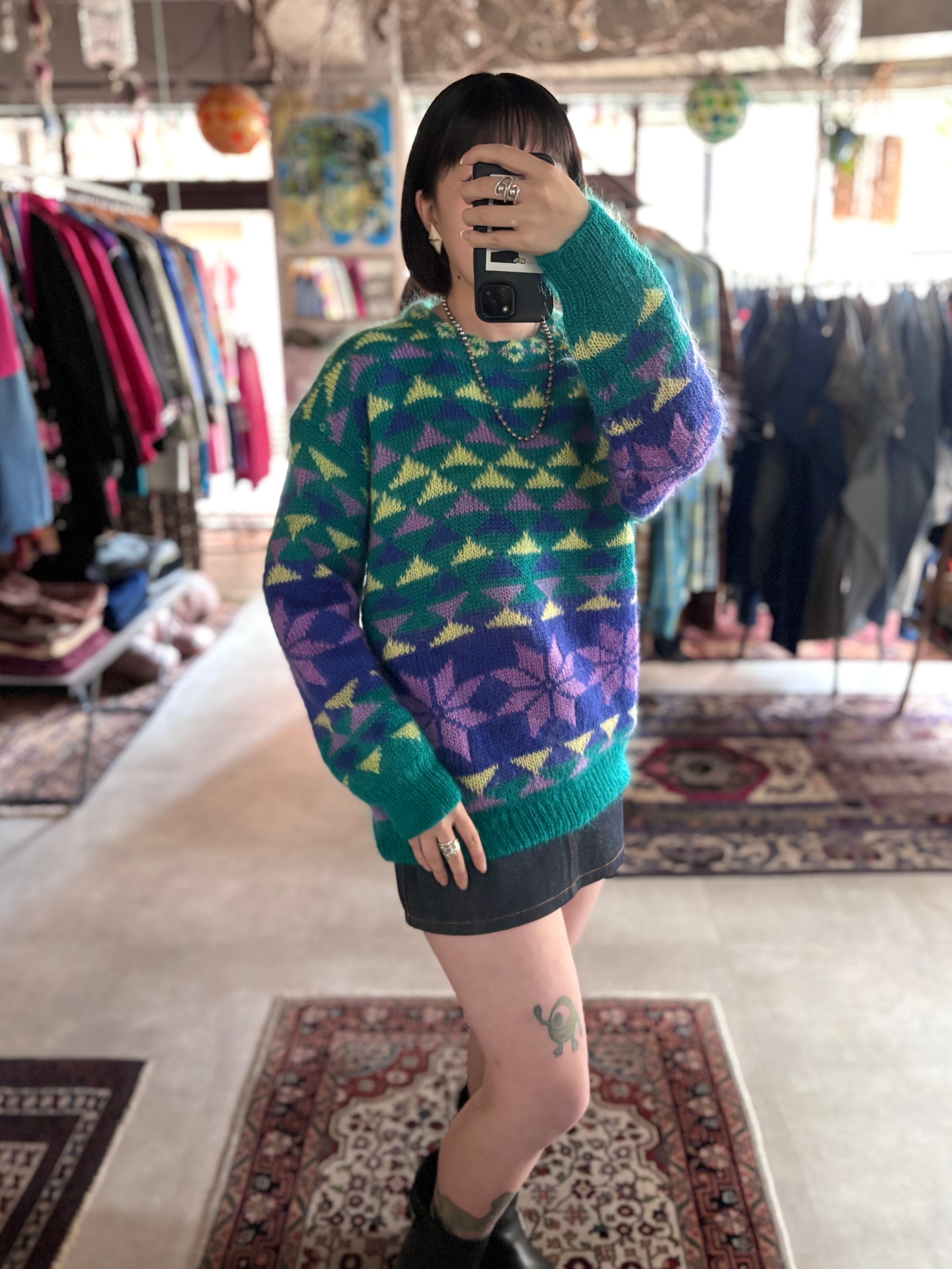 やわらかく肌触りの良いモヘアミックス素材。上質感が際立つ軽く暖かい着心地。程よくゆとりのあるシルエット。スノーフレイクとジオメトリックの組み合わせ。oasis好きにおすすめなマイナーカンパニー"Gallagher"製。1枚でコーデの主役になるニットです。