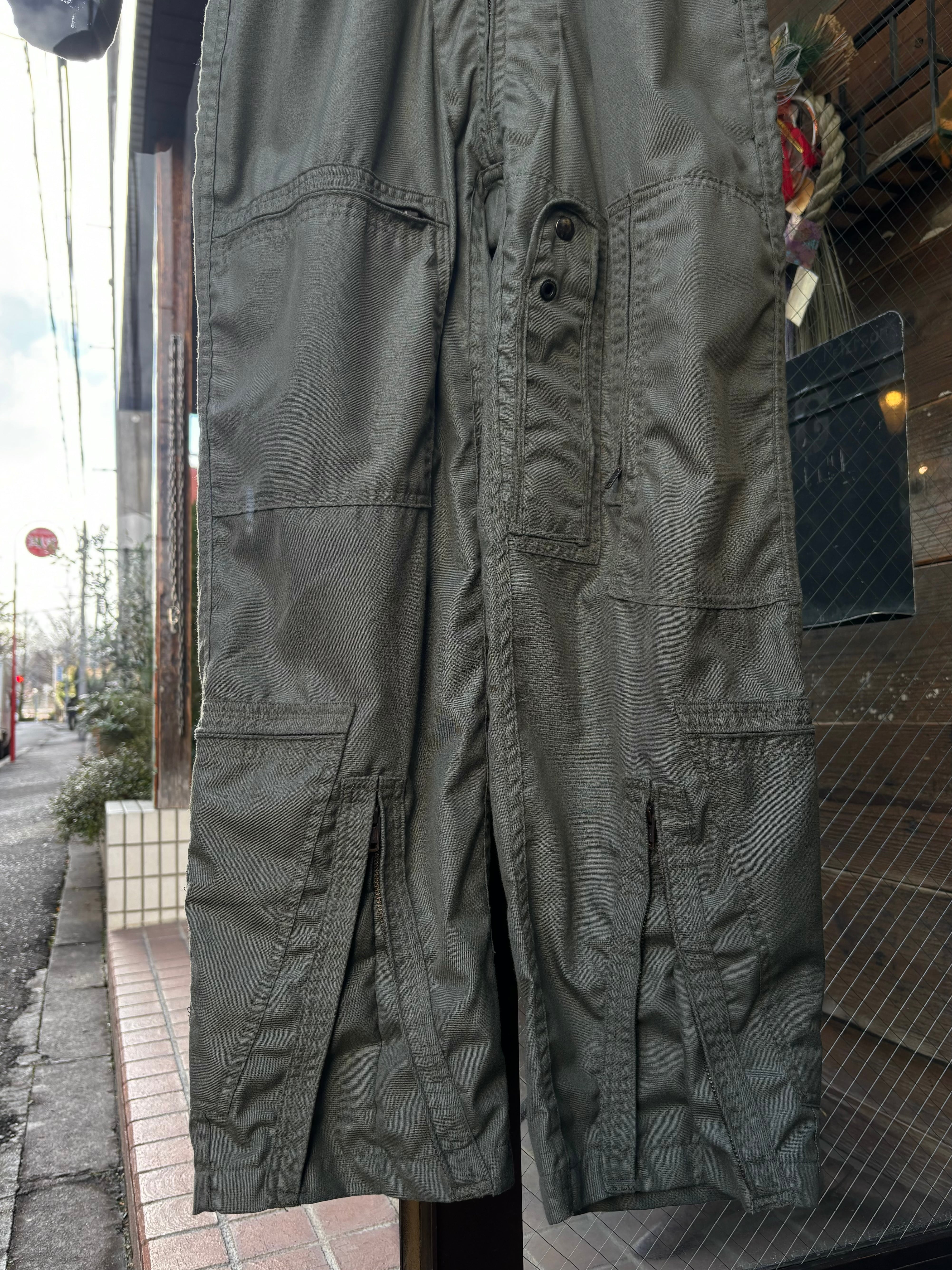 シャツ程度の軽い着心地に、落ち着いたカーキカラーの生地。75年製のビンテージオールインワン。ミリタリーらしい機能美を感じさせるディテール。幅広い着こなしを楽しめる大人のジャンプスーツ。