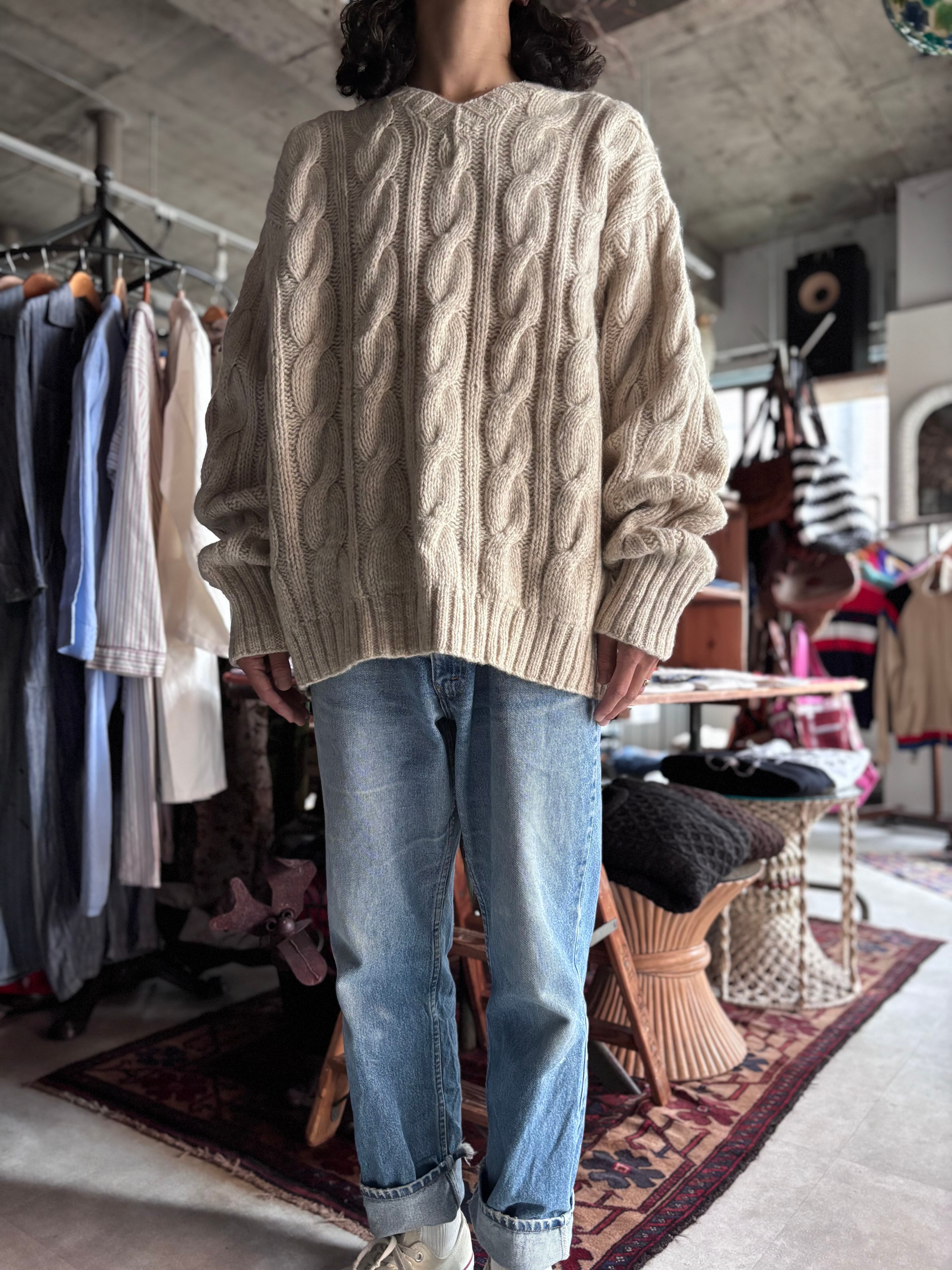 厚手のウール素材。リラックスシルエット。クラシカルなケーブルパターンに、浅めのVネック仕様。さほど着用感の少ない綺麗なコンディション。