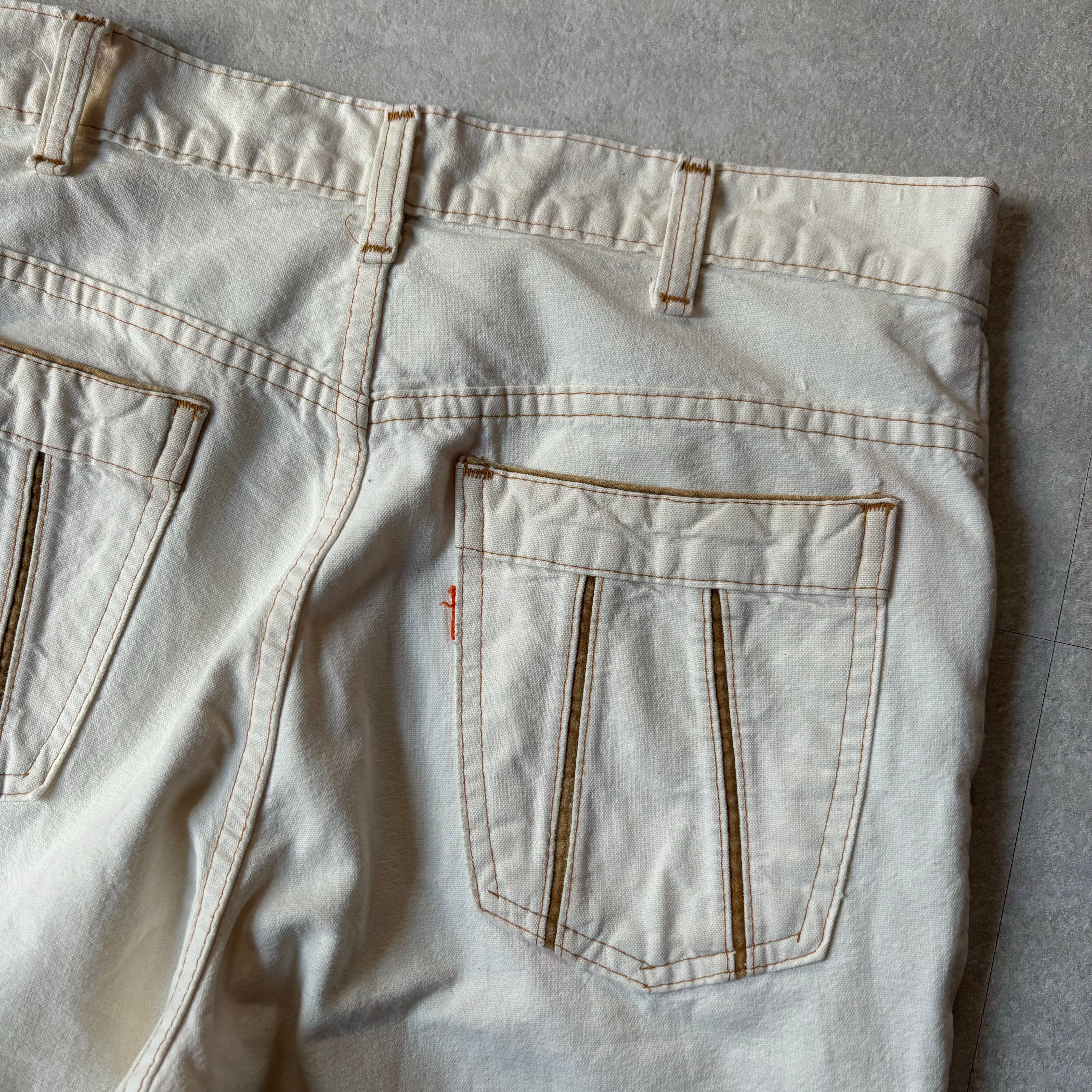 ドライな肌触りのキャンバス生地。綺麗なブーツカットシルエット。TALON42ジップ仕様。フロント、バックポケットともに珍しいデザイン。OLDディテールが際立つビンテージリーバイス。履き易い股上深めのシルエットです。