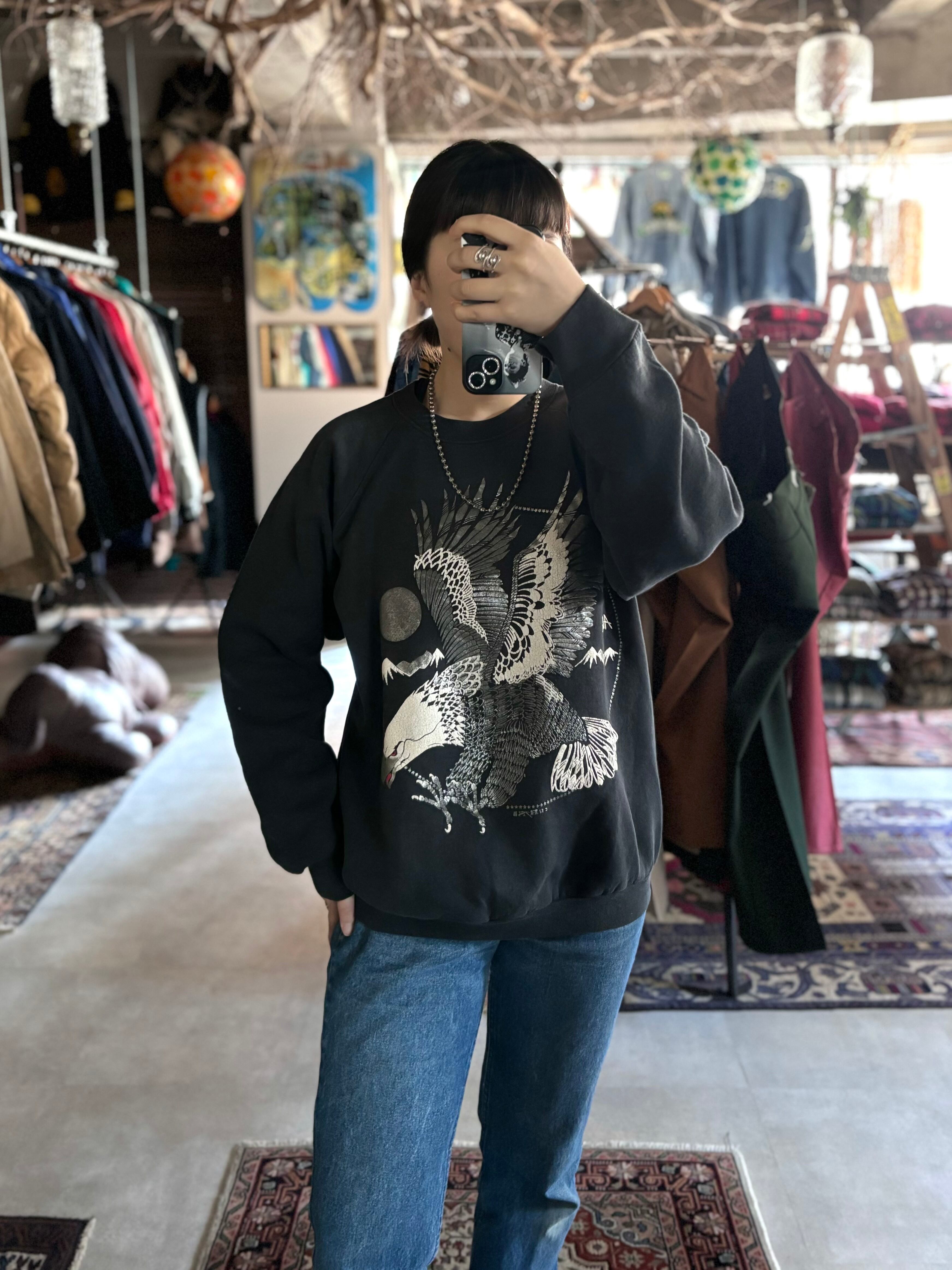 しっかりした厚みのコットン素材。ゆとりのあるリラックスシルエット。USA製のOLDフルーツボディ。力強いイーグルプリント。シルバーの羽に、赤目がSUPER COOL。おすすめです。