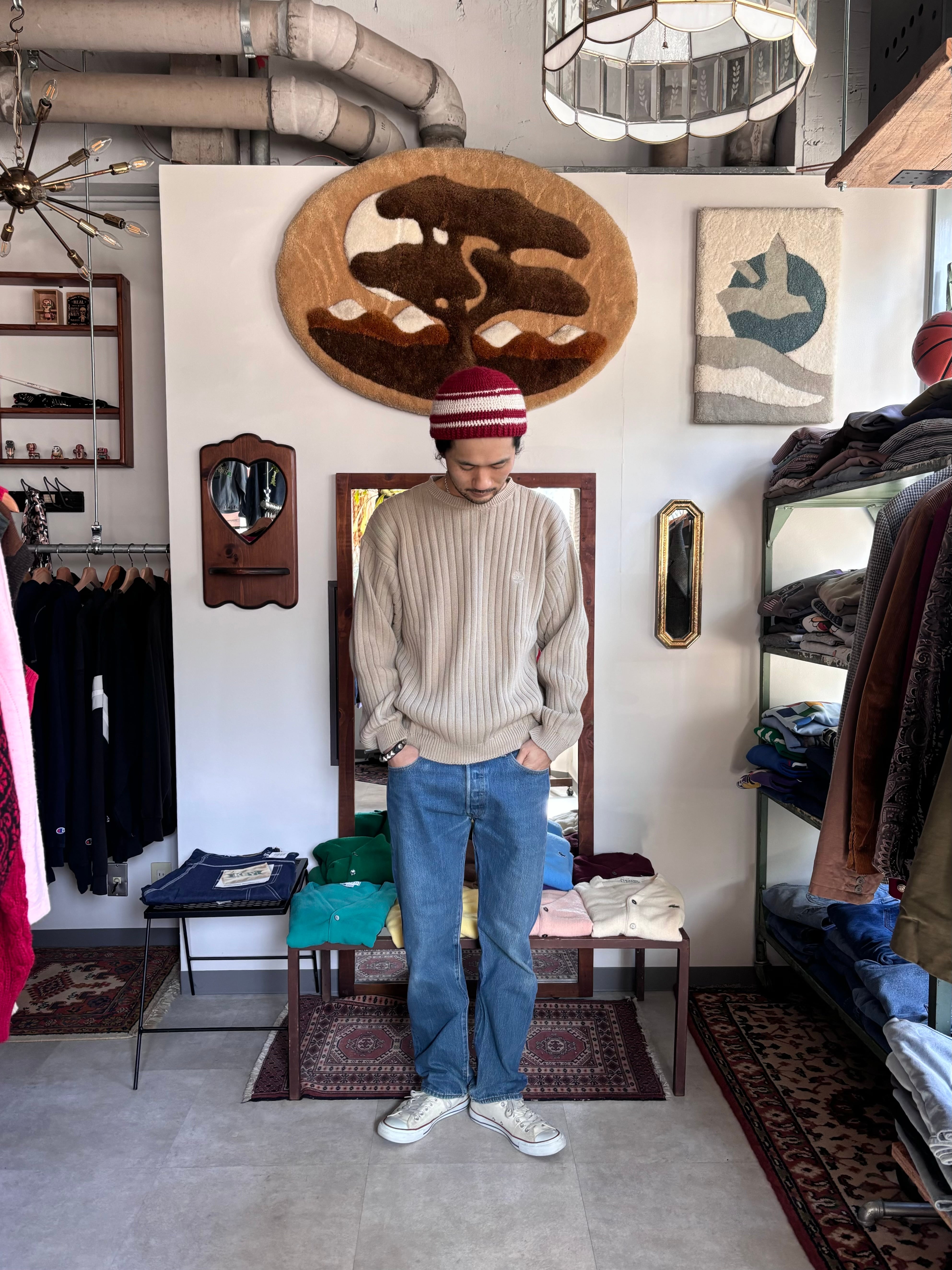 しっかりした厚みのコットンニット素材。ゆとりのあるリラックスシルエット。90sに比べ、ルーズ過ぎないフィット。サンドベージュカラーに、おしゃれ感抜群のリブ編み。落ち着いた雰囲気が魅力のOLDティンバー。